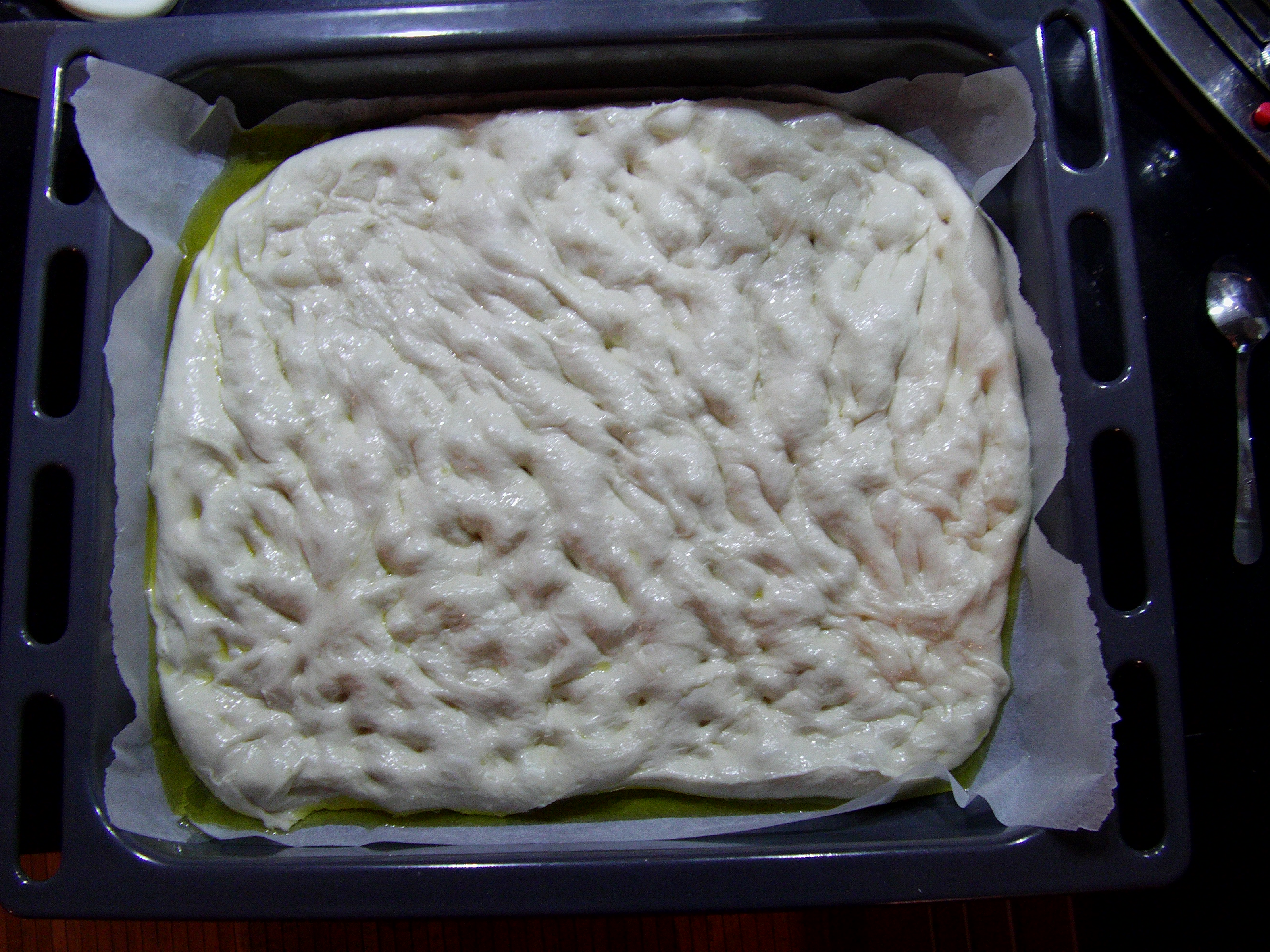 - Trascorsi i 20 min scoprire l'impasto e stenderlo sulla teglia con le mani ben unte, senza lavorarlo ulteriormente e praticando con le dita i classici buchi della focaccia;