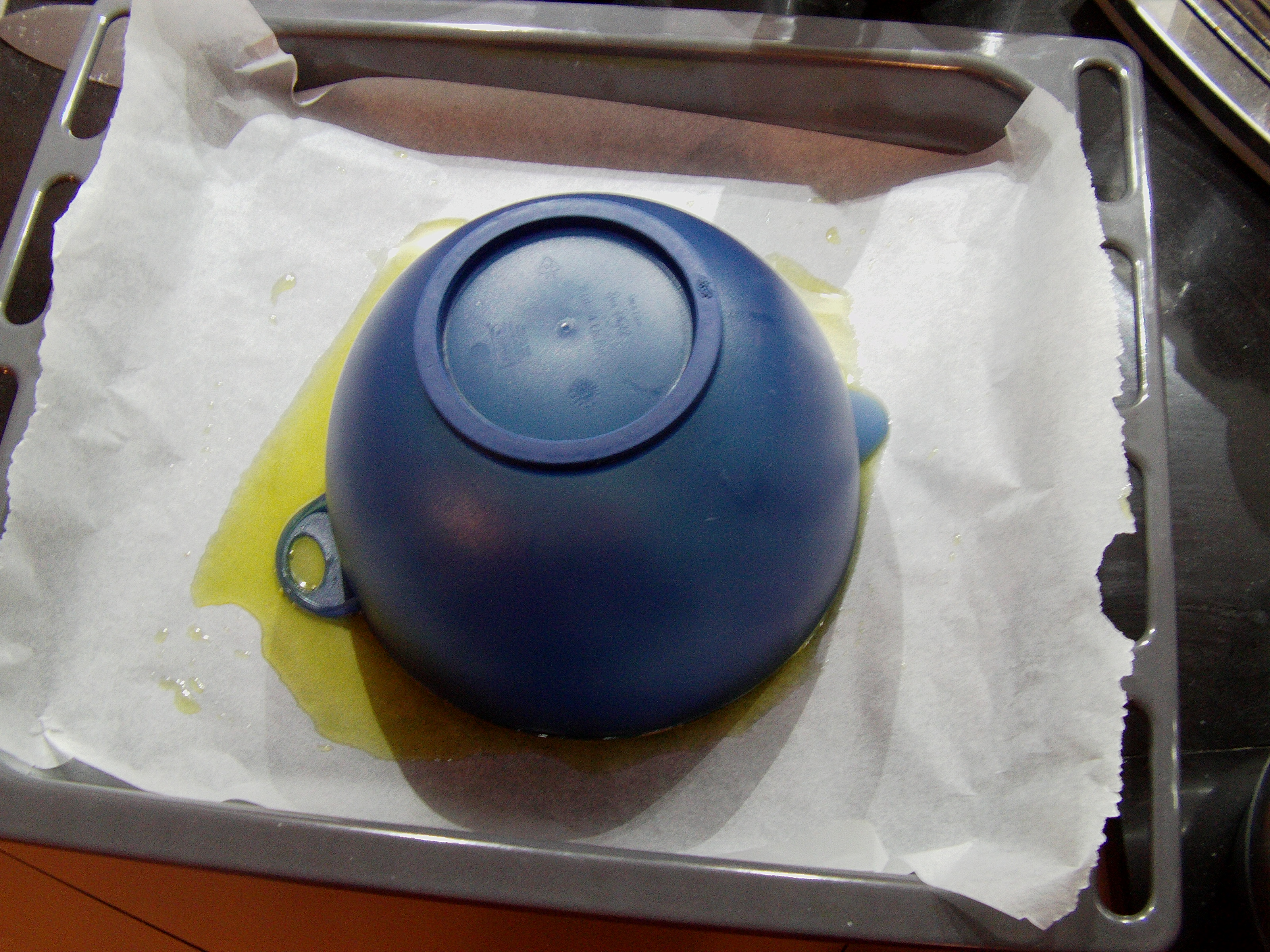 - Formare una palla al centro della teglia e ricoprirla con un contenitore abbastanza grande da contenerla: lasciare lievitare al riparo da correnti per 20 min;
