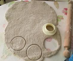 - nel piano di lavoro infarinato stendere col matterello infarinato il panetto, fino ad ottenere una sfoglia di 5 mm e con dei coppapasta tagliare le focaccine, i residui di pasta vanno ripresi, impastatati, tirati, tagliati per formare altre focaccine o piadine più grandi aiutandosi col matterello.