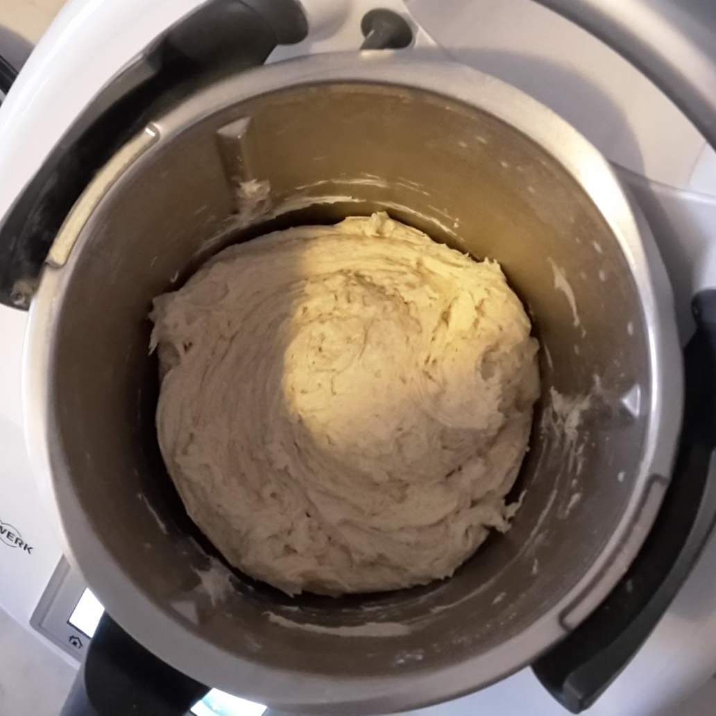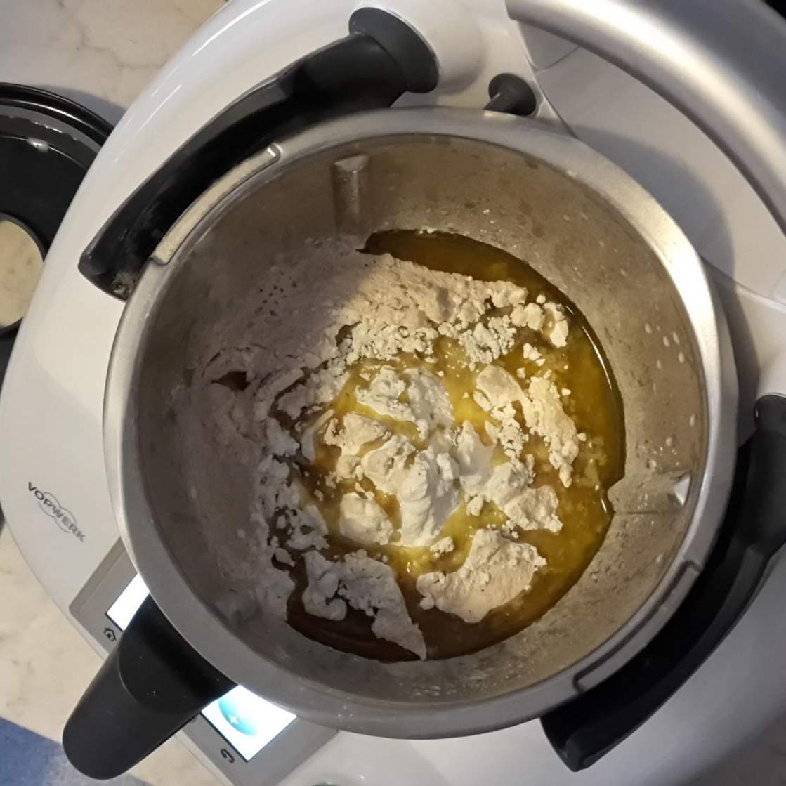 2. Versare tutti gli altri ingredienti occorrenti per l'impasto e impastare per 3 min vel