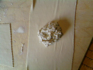 Fare un pò di pressione con le dita nella zona circostante il ripieno facendo in modo che le due sfoglie sovrapposte aderiscano bene e dopo tagliare l'impasto in una forma circolare del diametro di circa 9 cm e facendo in modo che il perimetro del disco di sfoglia così tagliato disti circa 1 cm dai bordi del ripieno, ottenendo una sorta di ravioli circolari.