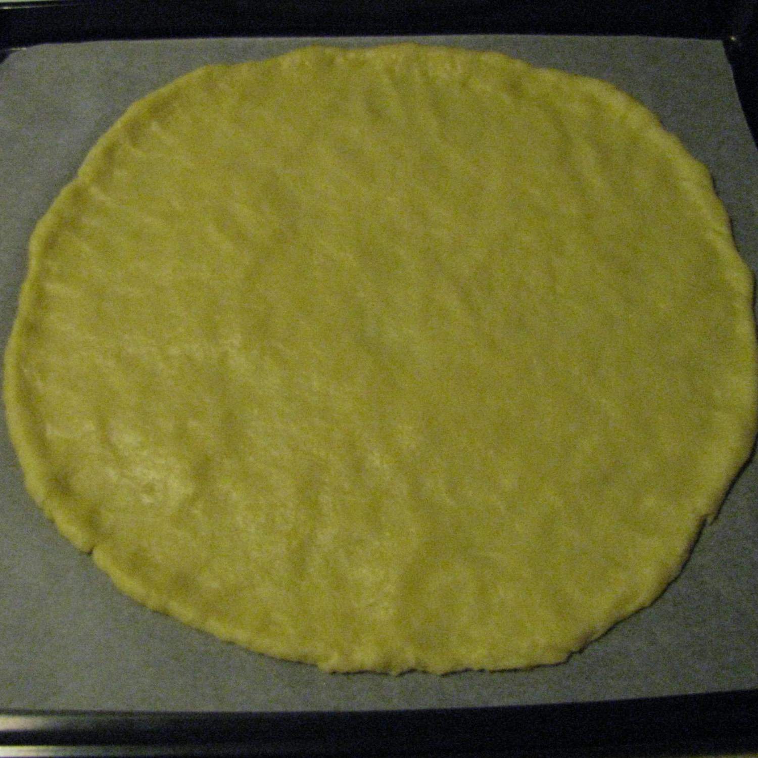 Stendere la pasta su un foglio di carta forno sopra una teglia, fino a ottenere un disco di 30 cm di diametro.