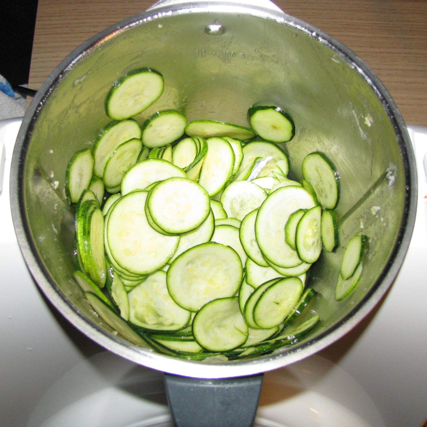 Mettere nel boccale non lavato zucchine, olio e sale, miscelare 10 secondi, antiorario, a velocità 1.