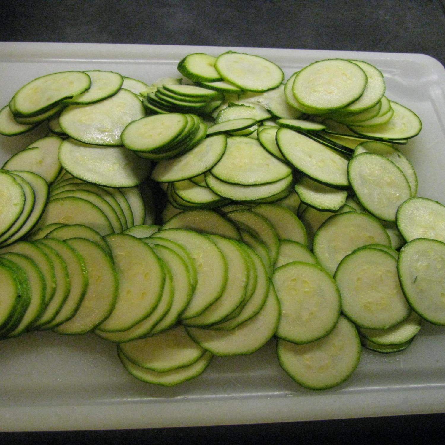 Tagliare le zucchine a rondelle molto sottili, di 1 millimetro di spessore.