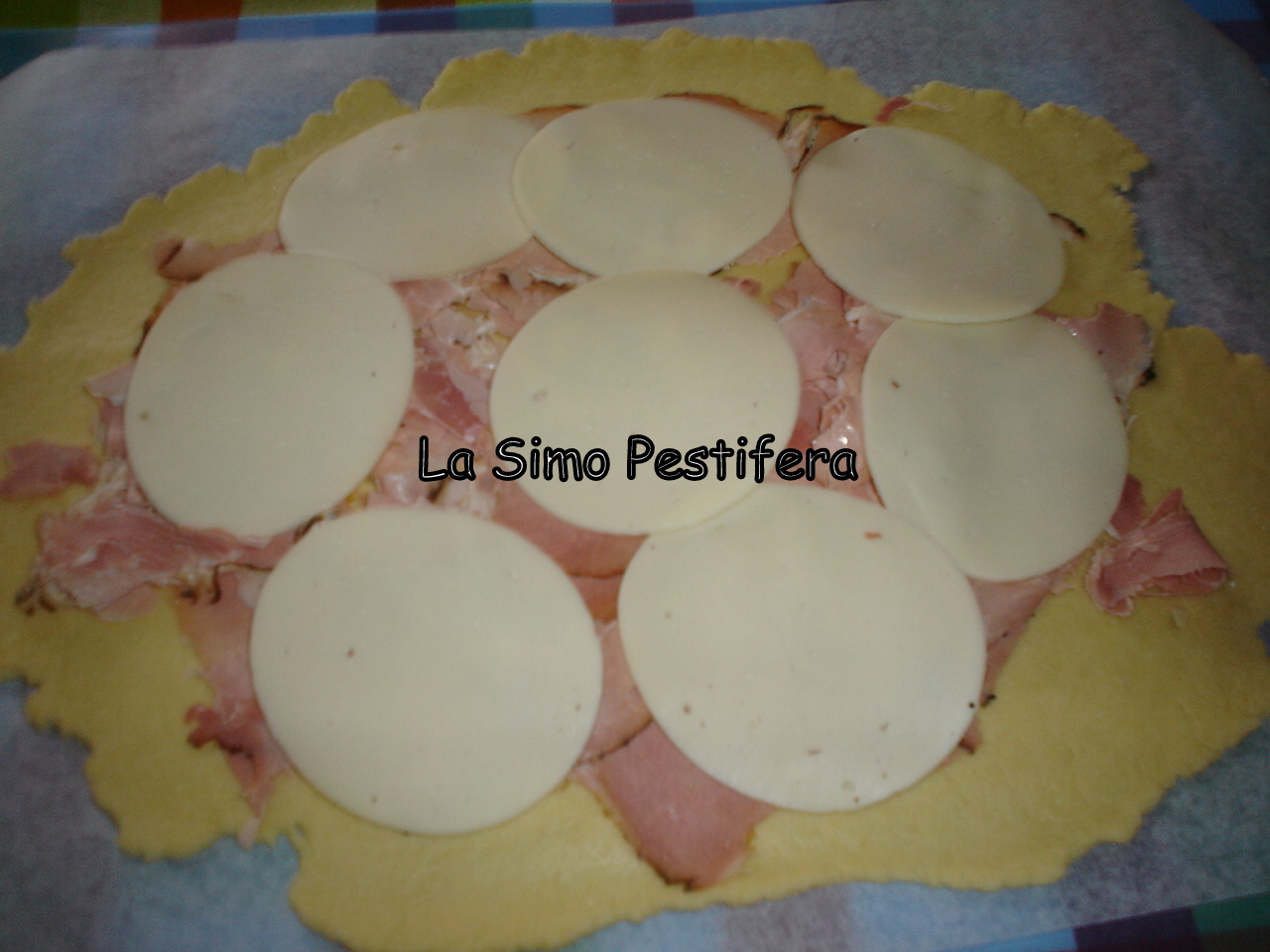 Stendere l'impasto tiepido su un foglio di carta forno fino ad ottenere un rettangolo di spessore di 4-5 mm, farcire con il prosciutto arrosto e la provola dolce, ripiegare i bordi e arrotolare in forma di strudel. Abbiate l'accortezza di mettere a contatto con la teglia da forno la parte in cui la pasta si sovrappone, in modo che in cottura si sigilli. Guarnire con semi di sesamo (io li spargo sulla carta da forno nella teglia e ci rotolo sopra lo strudel