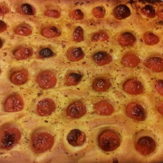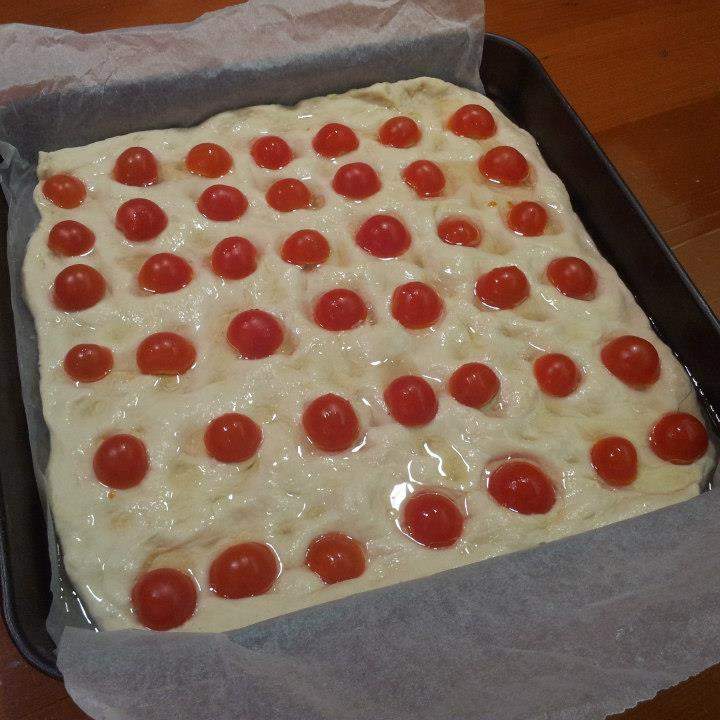 . 5 Lasciar lievitare l'impasto per un paio d'ore, dopodichè stenderlo, posizionare i pomodorini (come in foto) schiacciandoli e facendoli entrare bene nell'impasto. Mettere tutto il liquido dei pomodorini sulla focaccia e infornare per 20 minuti a 200° ventilato.