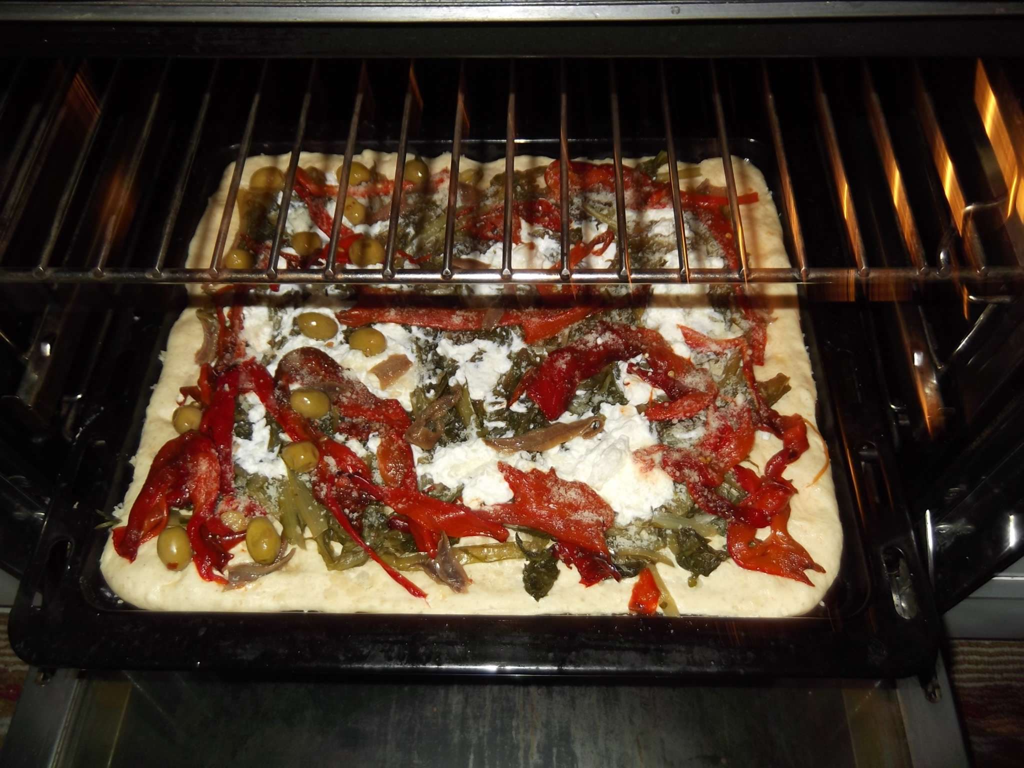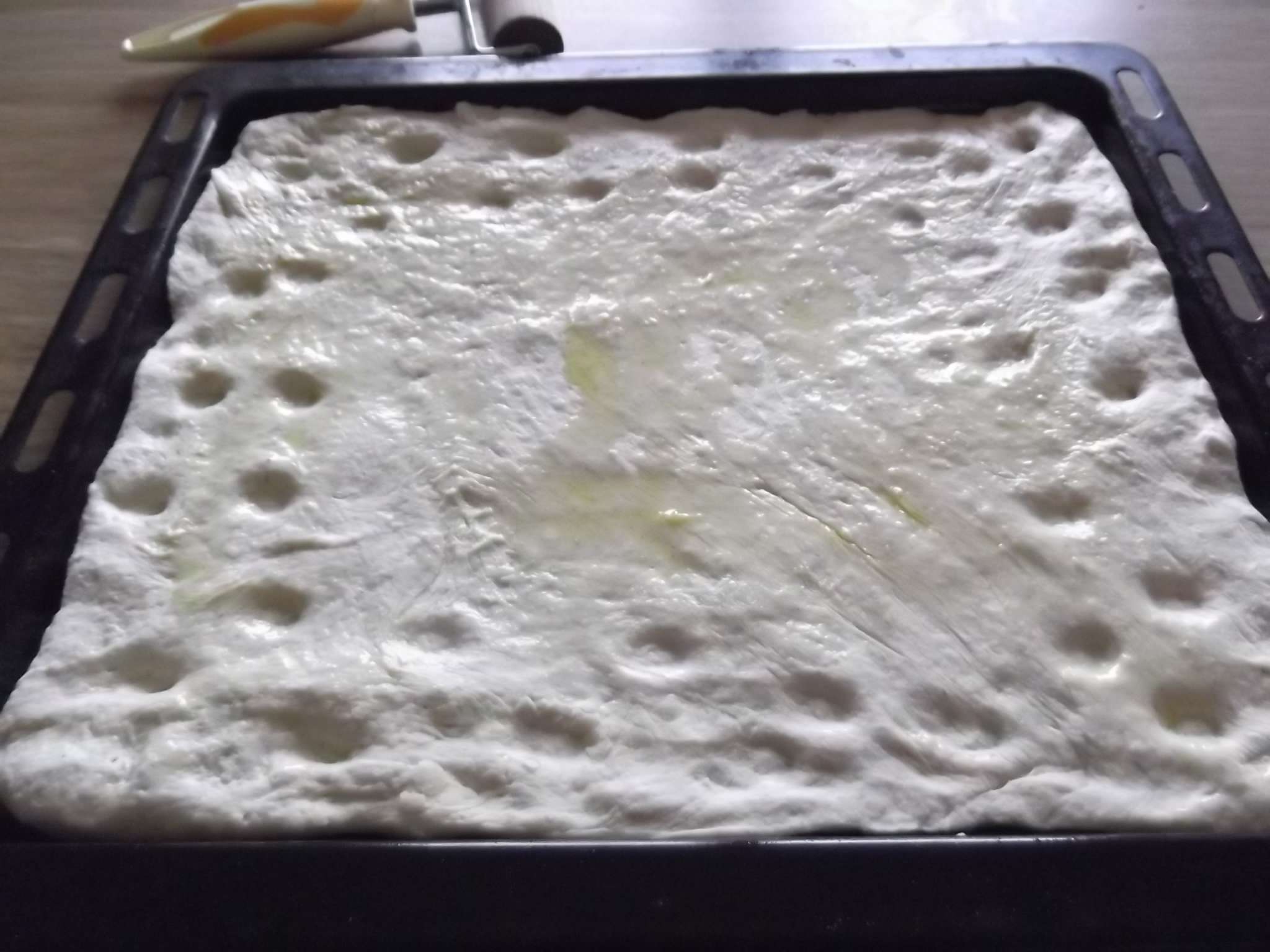 "coperchio chiuso" fare una palla, inciderla e metterla alievitare fino al raddoppio in forno spento a 50° con un pentolino di acqua bollente sul fondo del forno fino al raddoppio (circa 2 ore). Trascorso il tempo di lievitazione tirare fuori l'impasto dal forno, sgonfiarlo,stenderlo sulla teglia del forno,preventivamente oleata (15 g olio evo) e rimettere l'impasto nuovamente nel forno spento a lievitare fino al nuovo raddoppio.