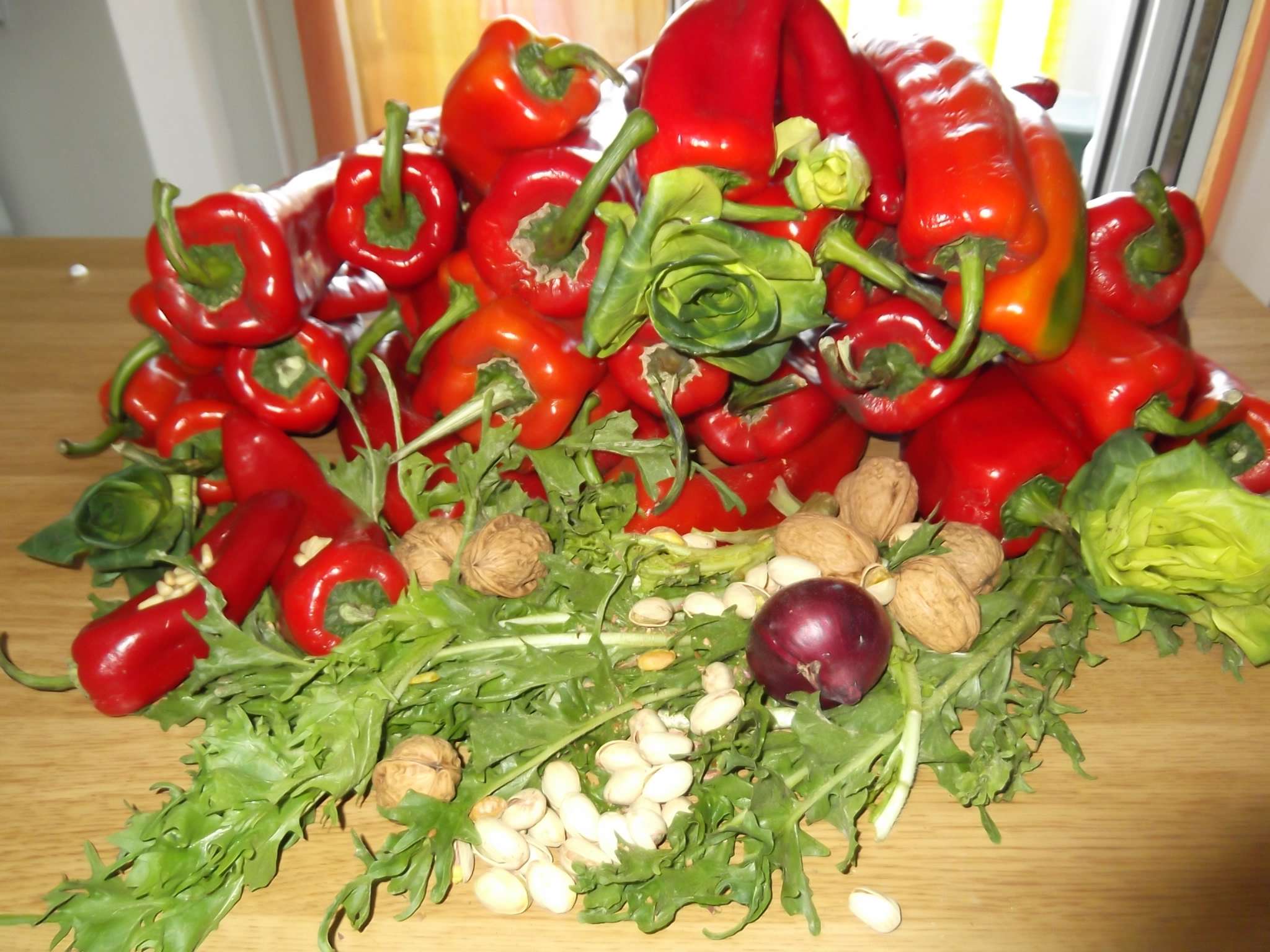 - 500 g di peperoni rossi, abbrustoliti in forno o sul grill e privati della pelle (anche surgelati già pronti) e tagliati a listarelle
