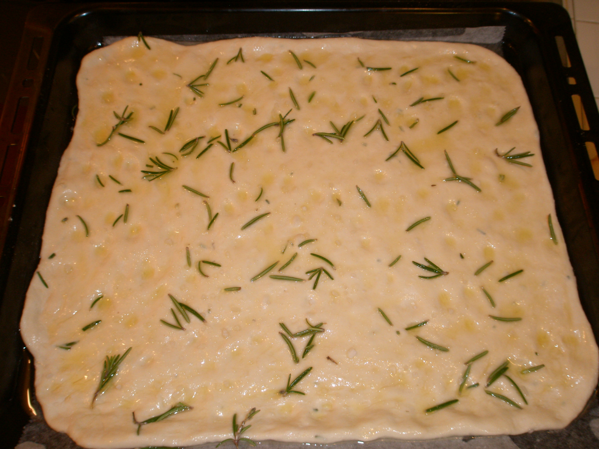 Spargere abbondante rosmarino, (freschissimo!). Aggiungere qua e la qualche pezzetto di sale grosso.
