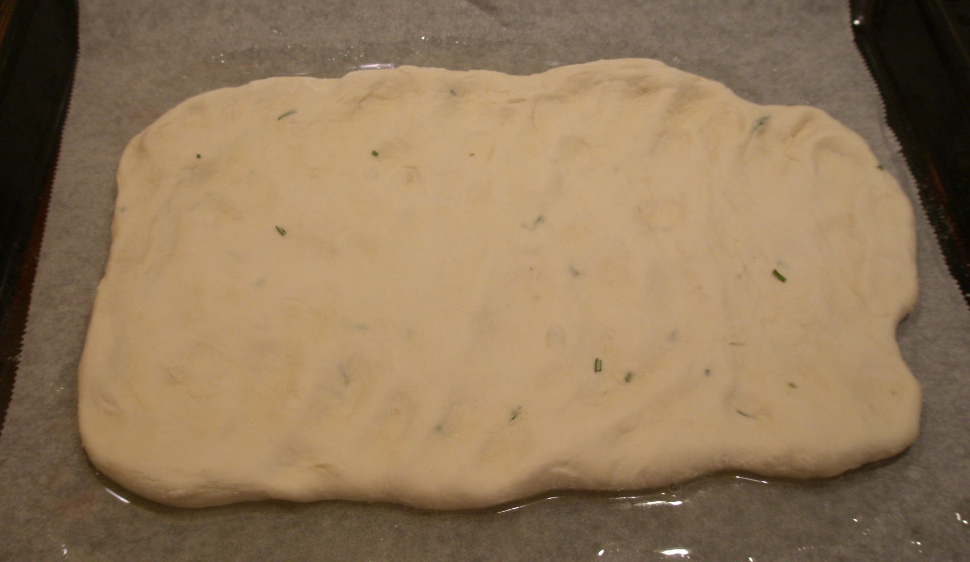 Questa focaccia va allargata con le mani, (non con il mattarello!), questo faciliterà la lievitazione e la renderà più friabile. Per questo ungere con un po' di olio di semi un foglio di carta forno poggiato su una leccarda. Allargare il più possibile la massa con le mani cercando di spianarla in maniera omogenea.