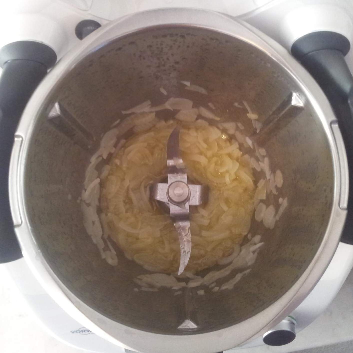 2. Aggiungere un misurino d'acqua e stufare le cipolle per 5 min 120° vel 1. Mettere da parte.