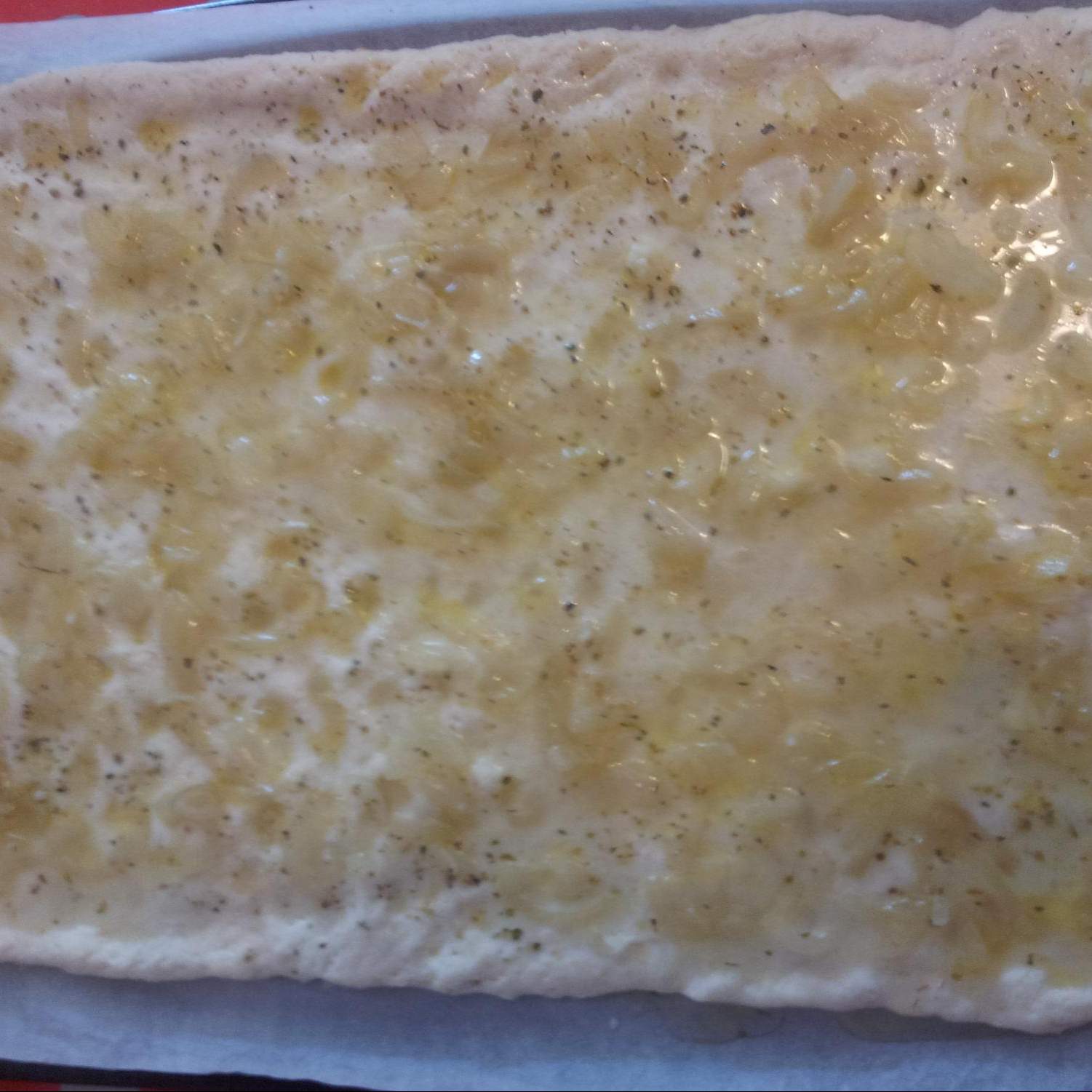 4. Stendere l'impasto, con i polpastrelli delle dita fare pressione sull'impasto per dare l"effetto focaccia e aggiungere le cipolle stufate precedentemente, l'origano, il sale grosso e i restanti 5 gr di olio evo emulsionati con 50 gr di acqua. Infornare per 20 min a 180°