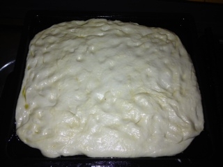Oliare una teglia da forno e mettere subito il composto sulla teglia e allargarlo leggermente e lasciarlo a lievitare per 1 ora in modo che raddoppi di volume.
