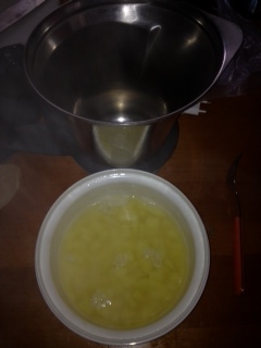 Sbucciare le patate e tagliarle a cubetti piccoli e cuocerle con i 500 g di acqua nel microonde x 7 minuti a 900 watt.