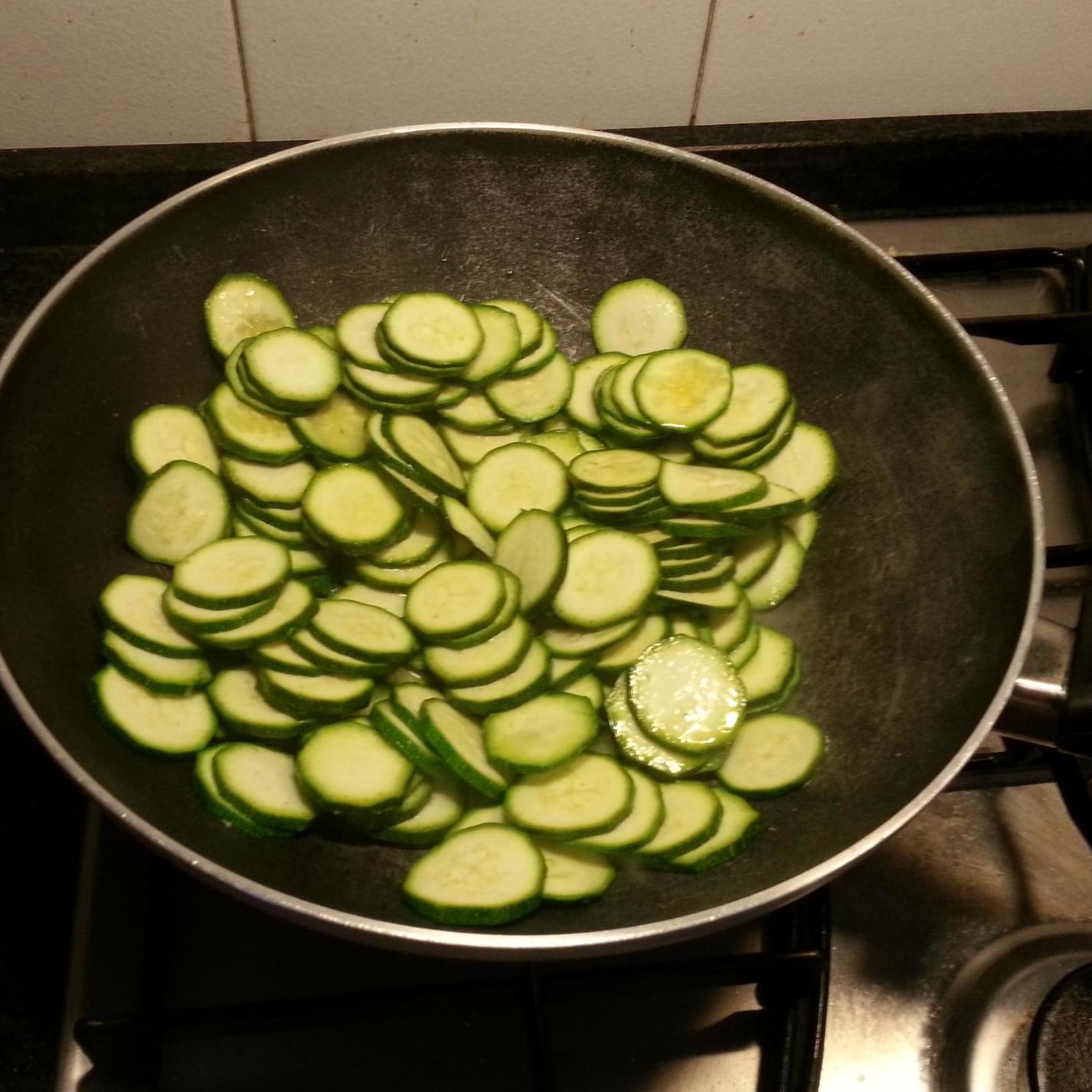 Tagliare le zucchine a rondelle e sfriggerle in padella con poco olio e sale, aggiungere l'erba cipollina e lasciar raffreddare.