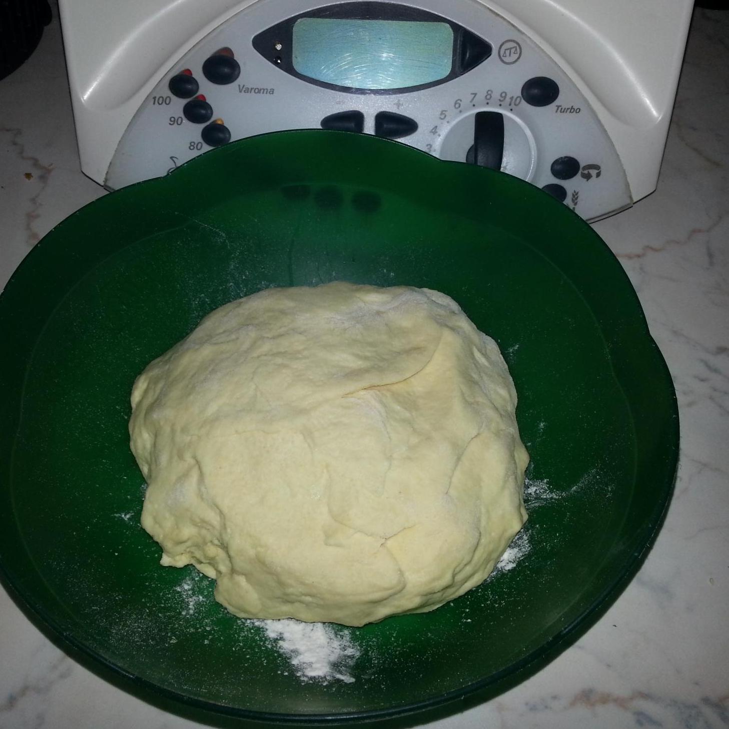 Mettere gli ingredienti nel boccale, versando poco per volta l'acqua finchè viene ben amalgamata dalla farina e si forma un panetto per 2 minuti vel.