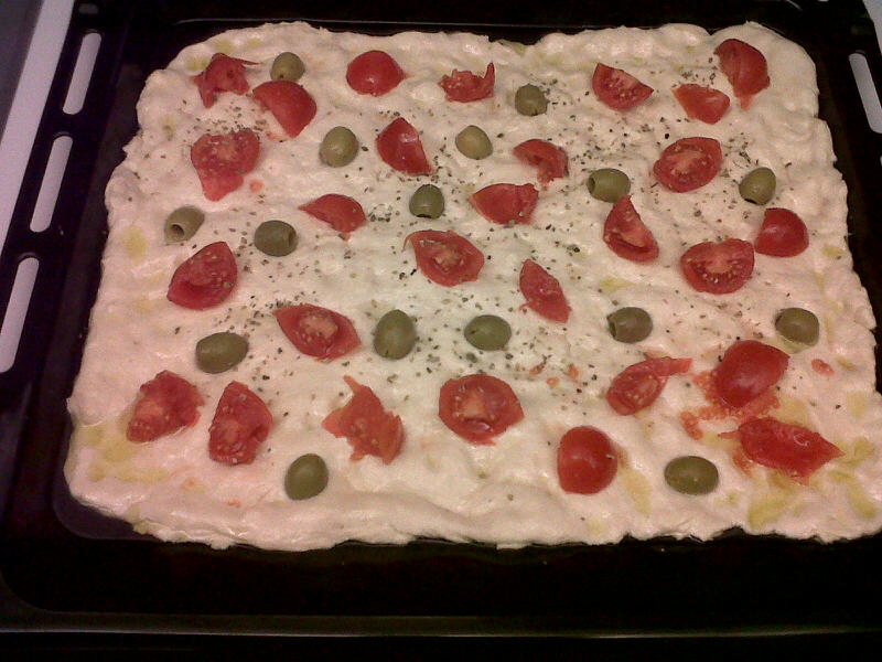 Passati 20 minuti stendere la focaccia e ricoprirla con i pomodorini a pezzetti, le olive snocciolate, il sale e l'origano.Lasciar lievitare per altri 90 minuti.