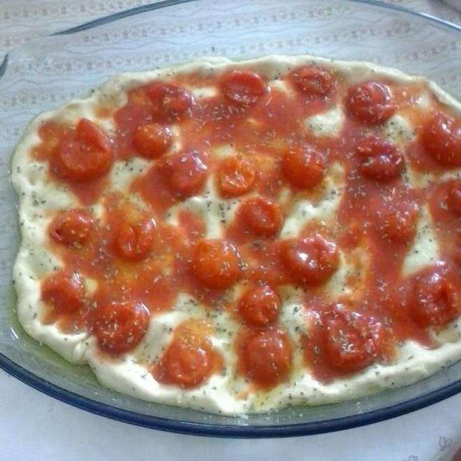 "velocità spiga" . Versare l'olio nella teglia, io ne uso una ovale da 35cm di lunghezza per 25 di larghezza. prendere l'impasto con le mani e cercare di allargarlo, io non uso mattarello, la lavoro tenendola in mano. Quando raggiunge la grandezza ideale metterla in teglia, rigirarla nell'olio e premerla con le dita per darle la forma finale e lasciare i solchi delle dita sulla superficie. A questo punto la focaccia dovrebbe essere ben oliata anche sopra. Se non lo fosse ungerla per bene. Ora possiamo mettere i pomodorini, premendoli nell'impasto, usare anche un pò della salsa dei pomodorini versandone qua e la sulla focaccia. Saliamo la superficie e spolveriamola di origano. Mettere nel forno FREDDO a 175° per 30 minuti. Servirla tiepida o calda. Ottima da fare a tocchetti in occasione di un buffet.