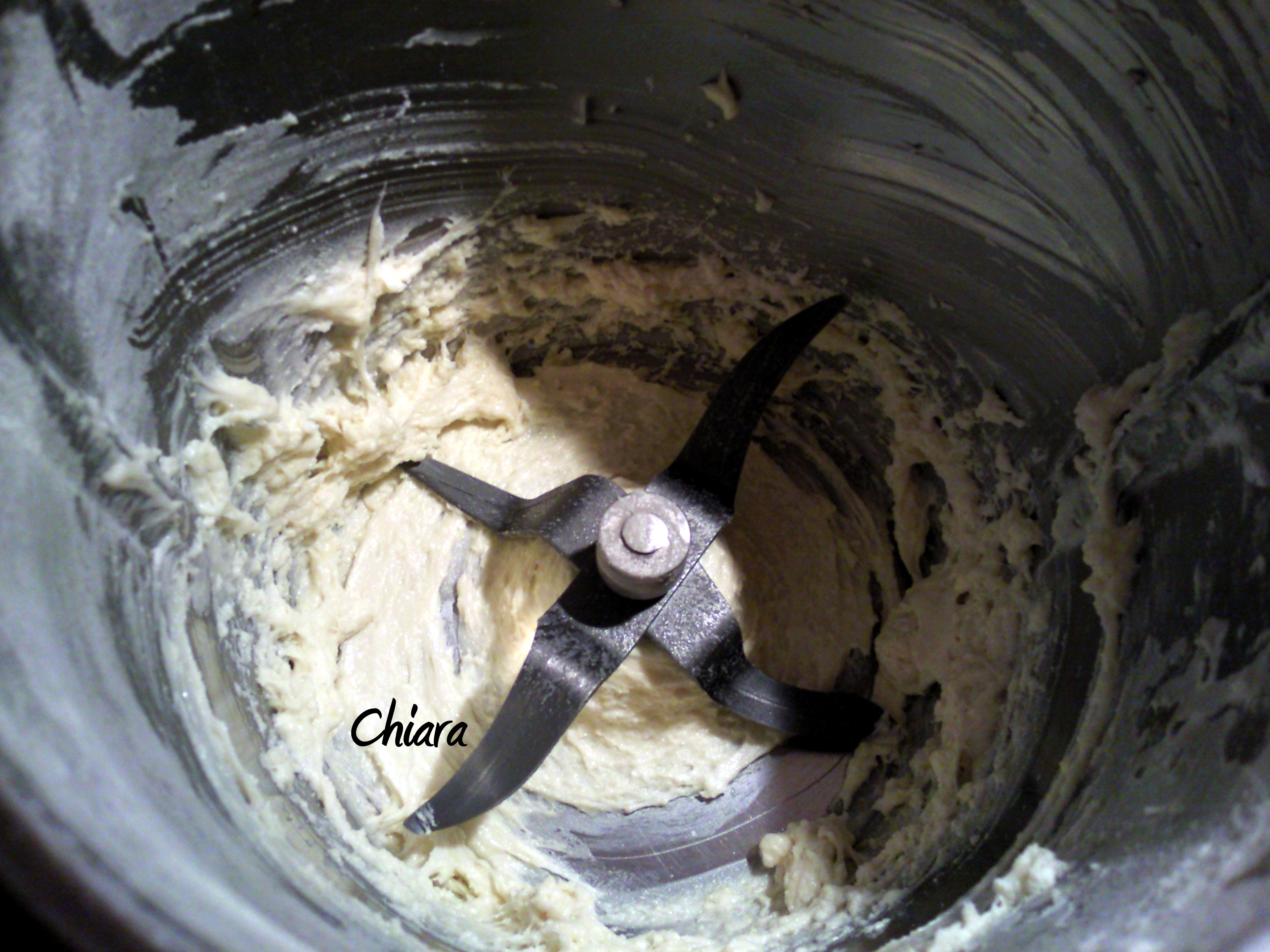 Versarlo sulla teglia da forno rivestita di carta forno; per togliere l'impasto rimasto sotto le lame dare un paio di colpi di Turbo.
