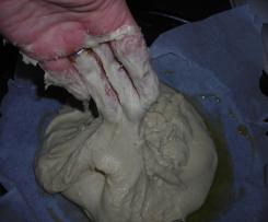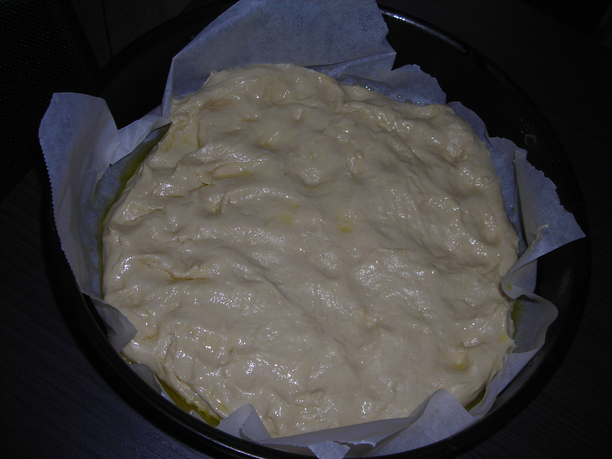 "velocità spiga" , l'impasto sembra morbido e un po' appiccicoso; - Lasciare lievitare nel boccale 45 min e poi metterlo in una teglia rivestita con carta da forno unta d'olio, stendere con le mani e lasciare lievitare per un'ora circa (io la metto sempr nel forno spento, tiepido);