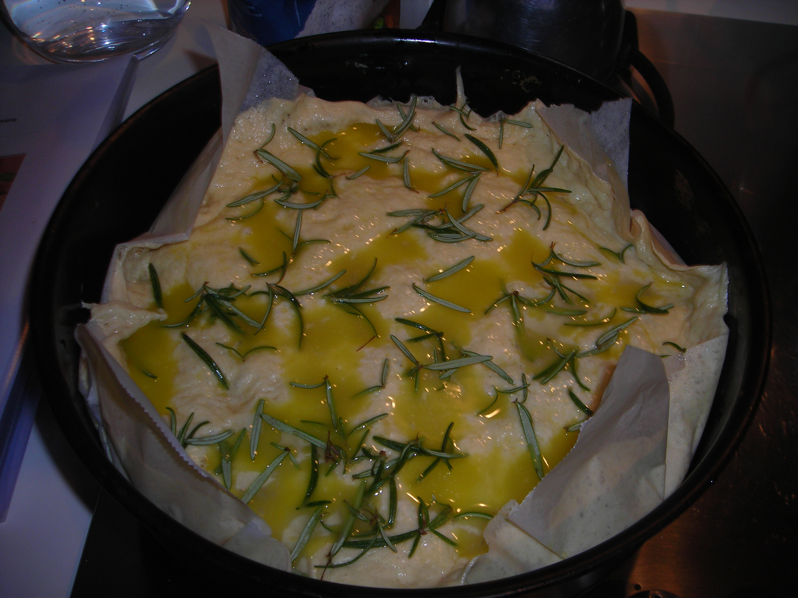 - Prendere la teglia con la focaccia e fare delle fossette con le dita, bagnare con la emulsione e spargere su il rosmarino;