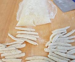 - Tagliare l’impasto in due rettangoli più stretti e con un tarocco staccare dei bastoncelli larghi circa un centimetro.