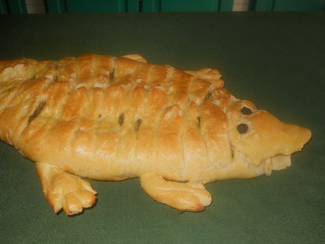 - Dare alla pasta messa da parte la forma delle zampe del coccodrillo e del muso, Poggiare lateralmente le zampe e il muso ad una delle estremità, posizionandovi due olive nere per gli occhi, chiudere l'altra estremità e praticare dei piccoli tagli ai lati dando la forma di una coda;