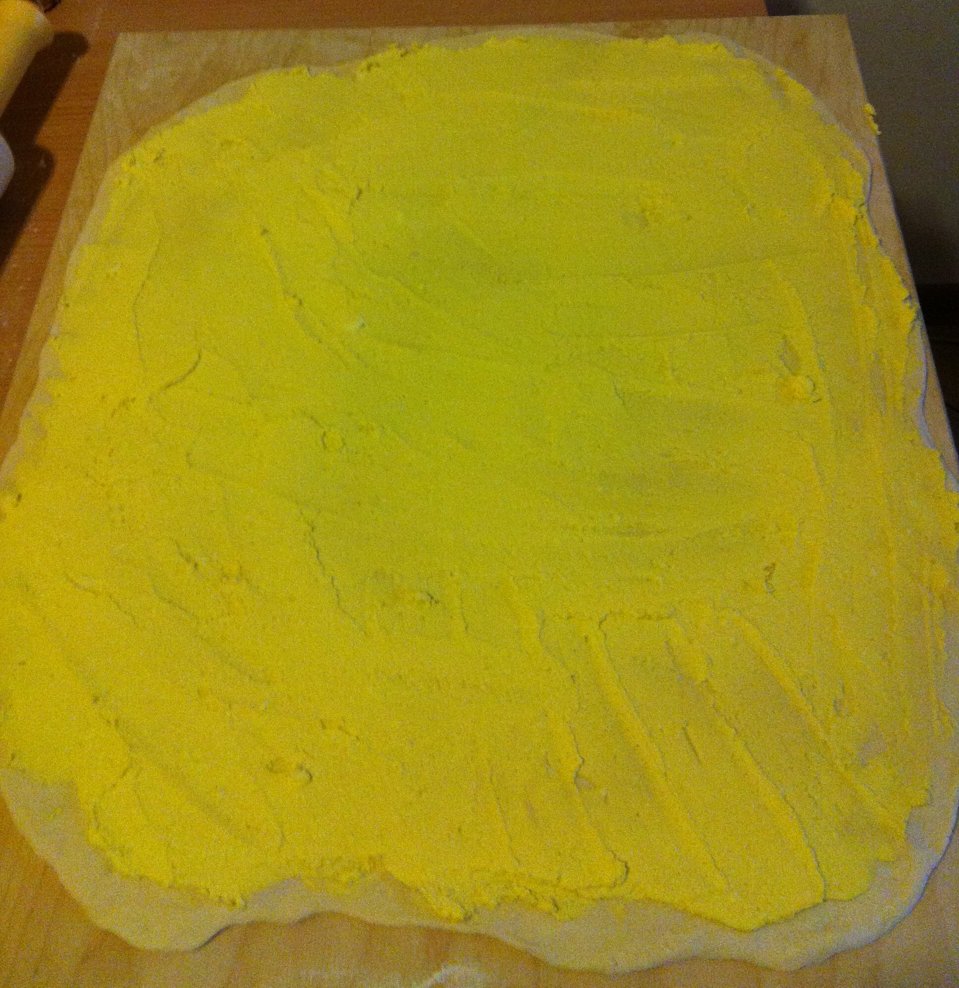 "coperchio chiuso" con la spatola. chiudere e amalgamare ancora 20 sec vel 4.stendere la pasta in una sfoglia di 2/3 mm. spalmare con la crema ottenuta e arrotolare la sfoglia.