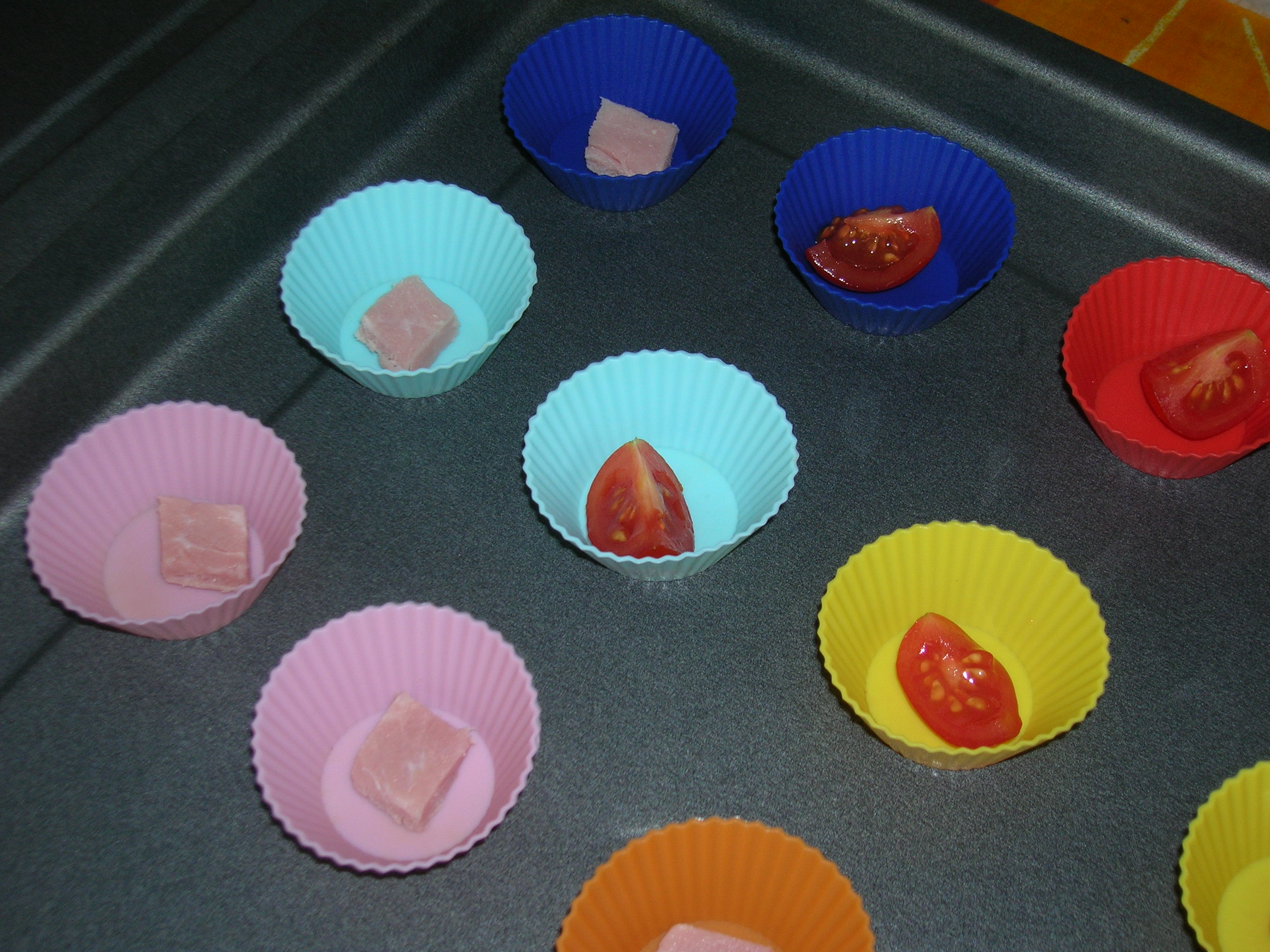 - Mettere nei pirottini di silicone o mini stampini gli ingredienti che più vi piacciono (un quartino di pomodorino, un'oliva, un funghetto, un quadretto di prosciutto cotto, ecc......).