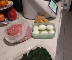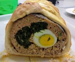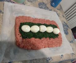 - 3. Stendere l'impasto su un foglio di carta forno leggermente oliato. Dare una forma rettangolare. Stendere sopra uno strato di spinaci bolliti e posizionare le uova (vedi foto). Con l'aiuto della carta forno dare forma al polpettone e chiudere le estremità.