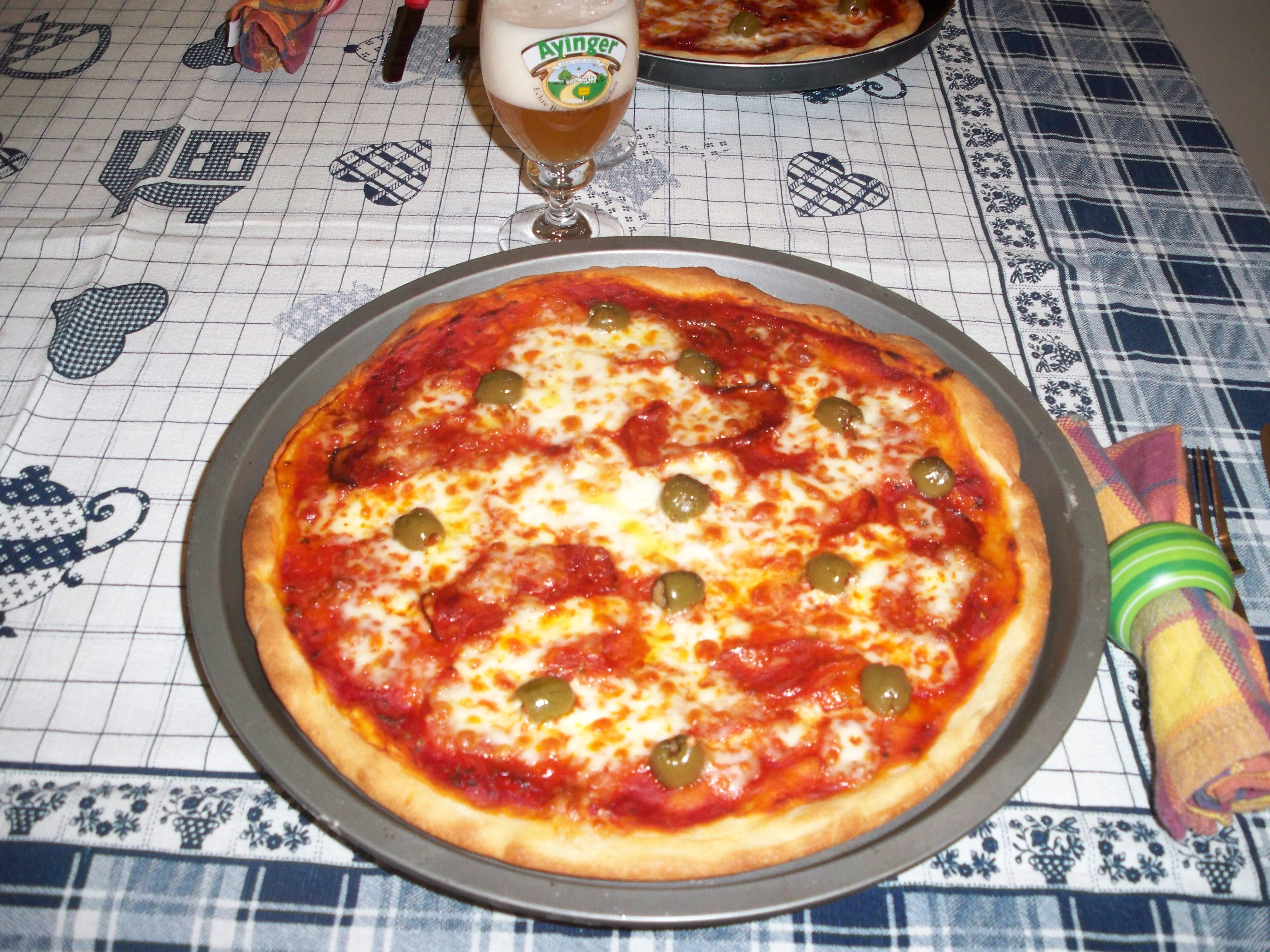 STENDERE LA PASTA(IO LA PREFERISCO SOTTILE)E CONDIRE CON LA SALSA,LE FETTE DI SALAME PICCANTE E LE OLIVE.