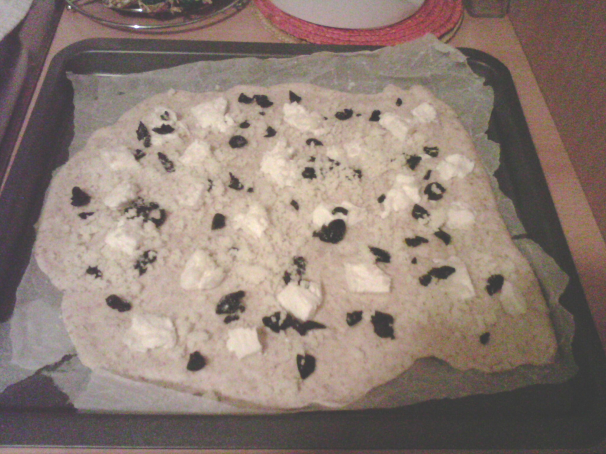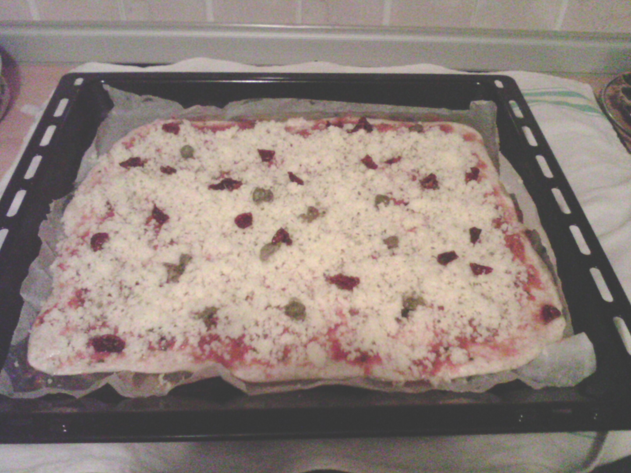- cospargere d'olio- Condire con un mix di galbanino e scamorza (tritata nel bimby : 15sec- vel 7), passata di pomodoro fresca bimby e origano. Io ho messo qualche cappero e pomodoro secco.
