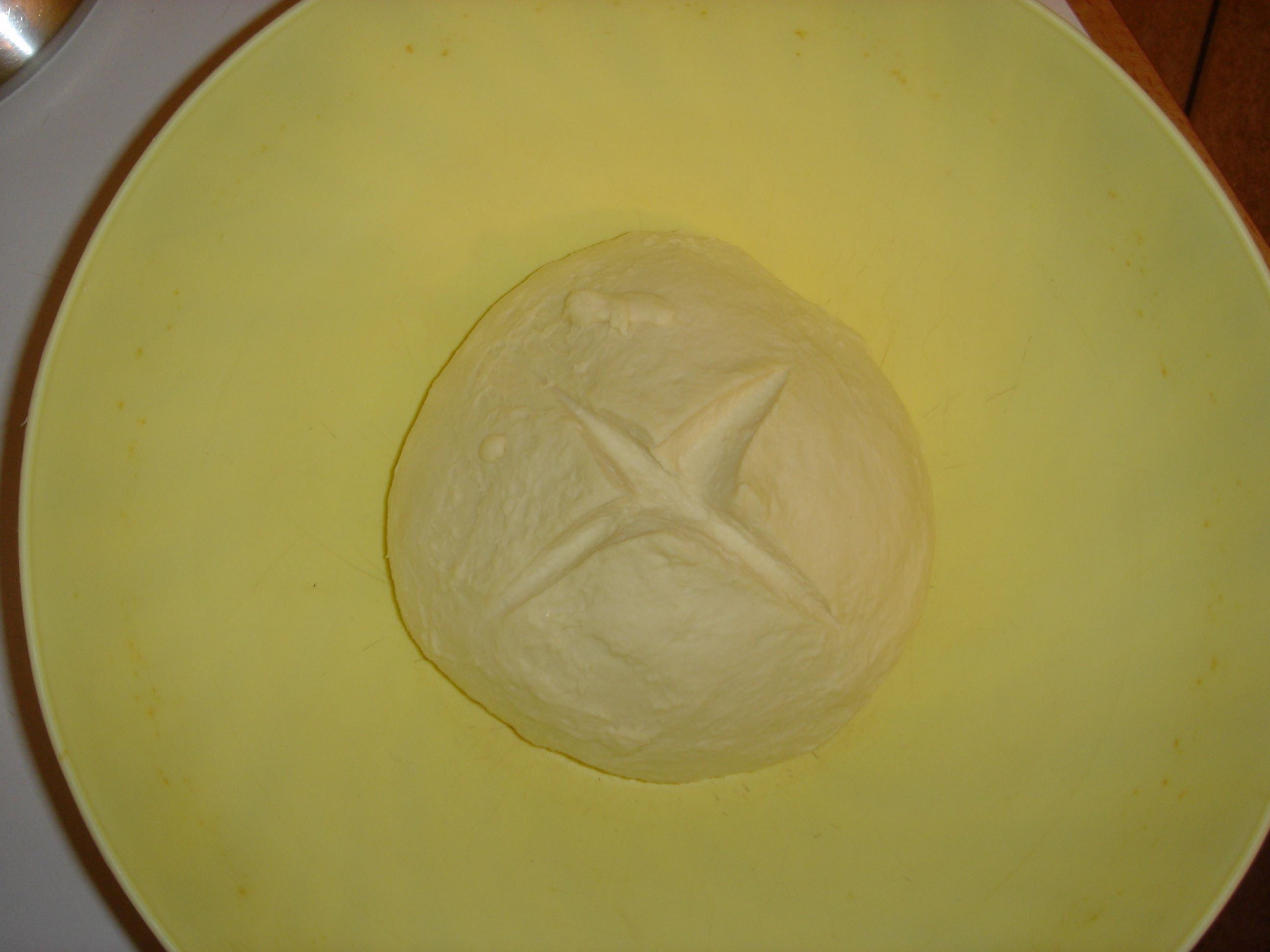 "velocità spiga" - Con le mani formare un panetto, inciderlo a croce e lasciare lievitare in una scodella di plastica, coperta con un telo, per 1 ora.