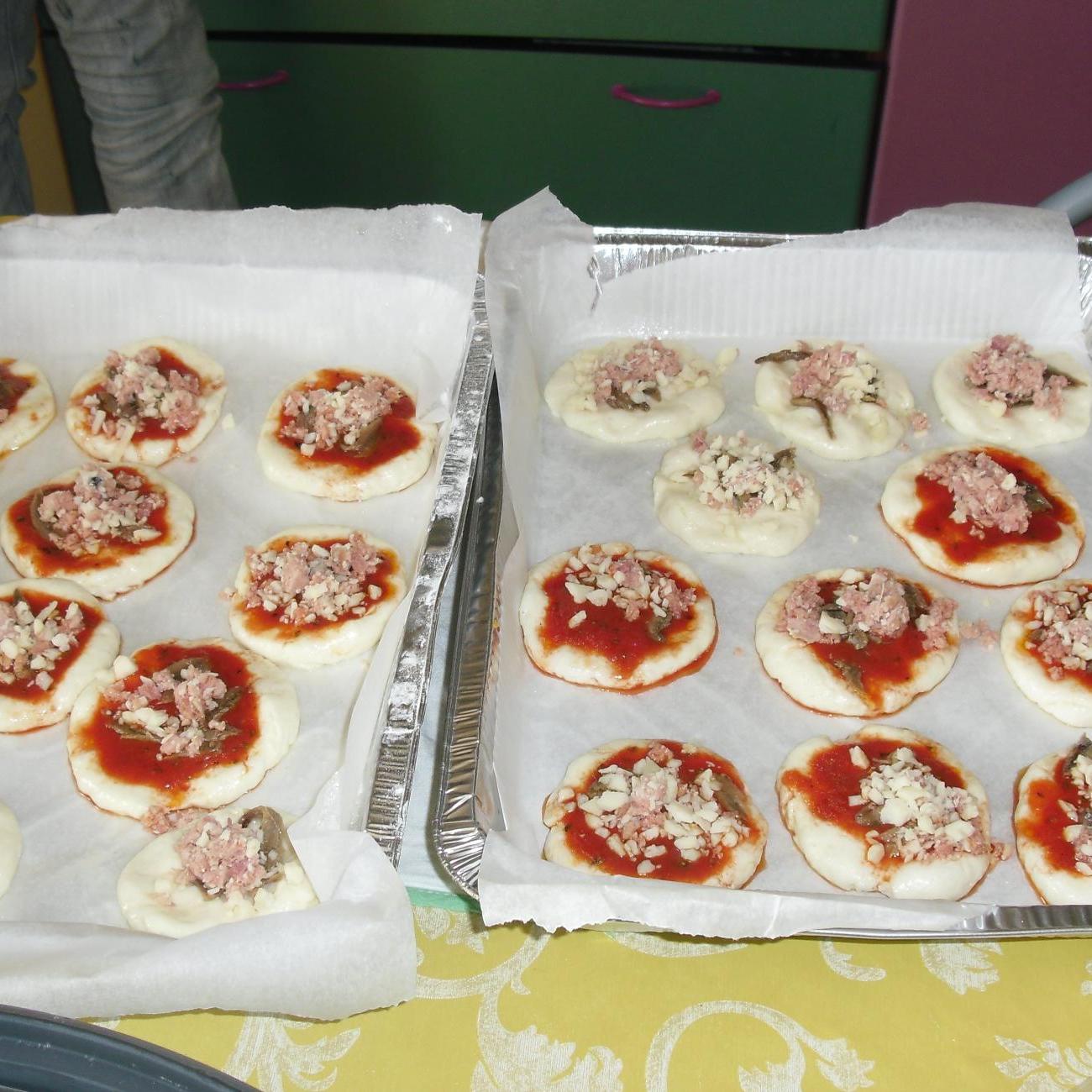 Queste pizzette possono essere condite con mozzarella e prosciutto(da prontuario).