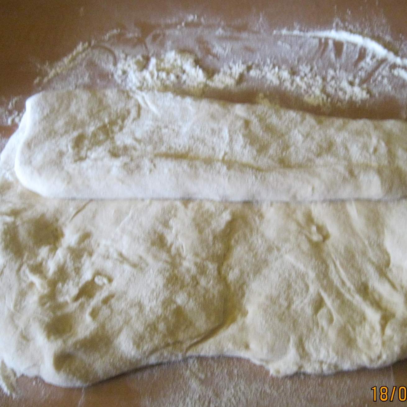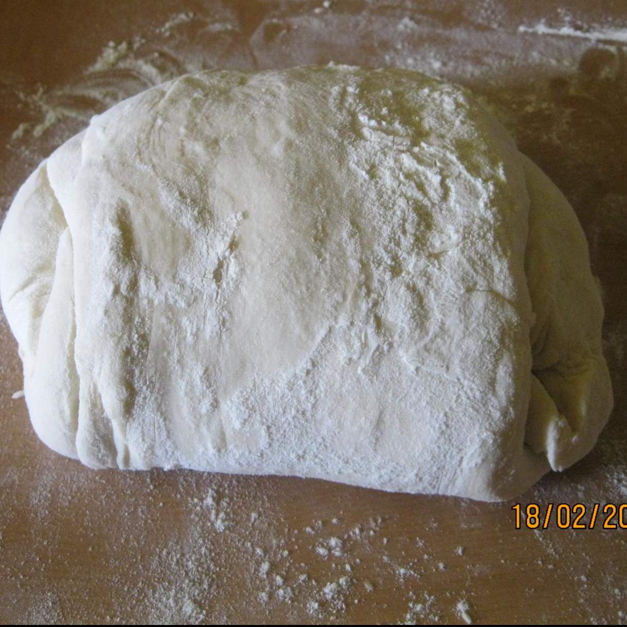 .Togliere l'impasto aiutandosi con la spatola è molto appiccicoso, versare un pò di farina sulla spianatoia e formare un rettangolo con le mani ,piegarlo in 3 parti . - Mettere a lievitare in una ciotola coperta da pellicola fino al raddoppio
