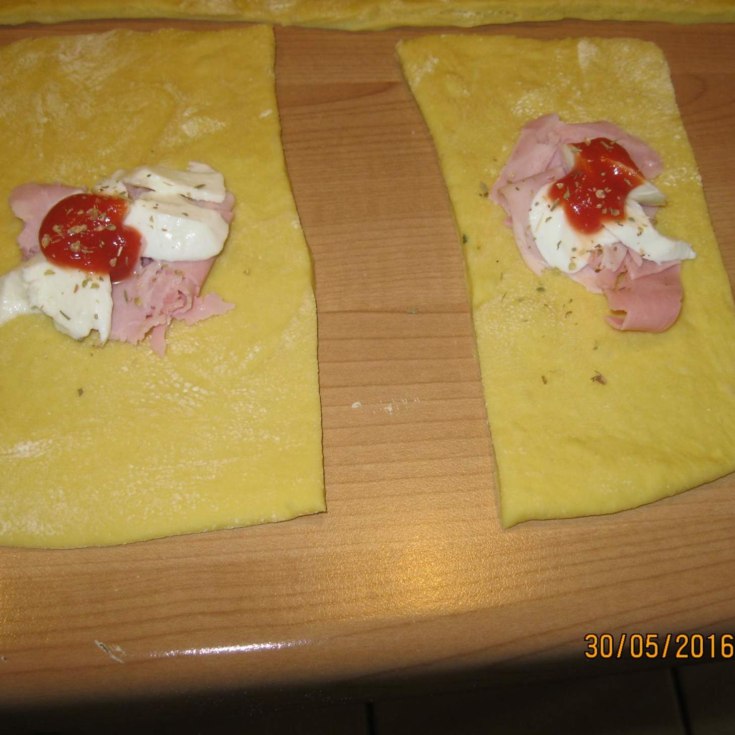 Formare dei rettangoli di 17 per 8 cm tutto dipende dalla vostra teglia.Distribuire un po di mozzarella tagliata a cubetti ,un po di prosciutto,un po di passata , sale e origano