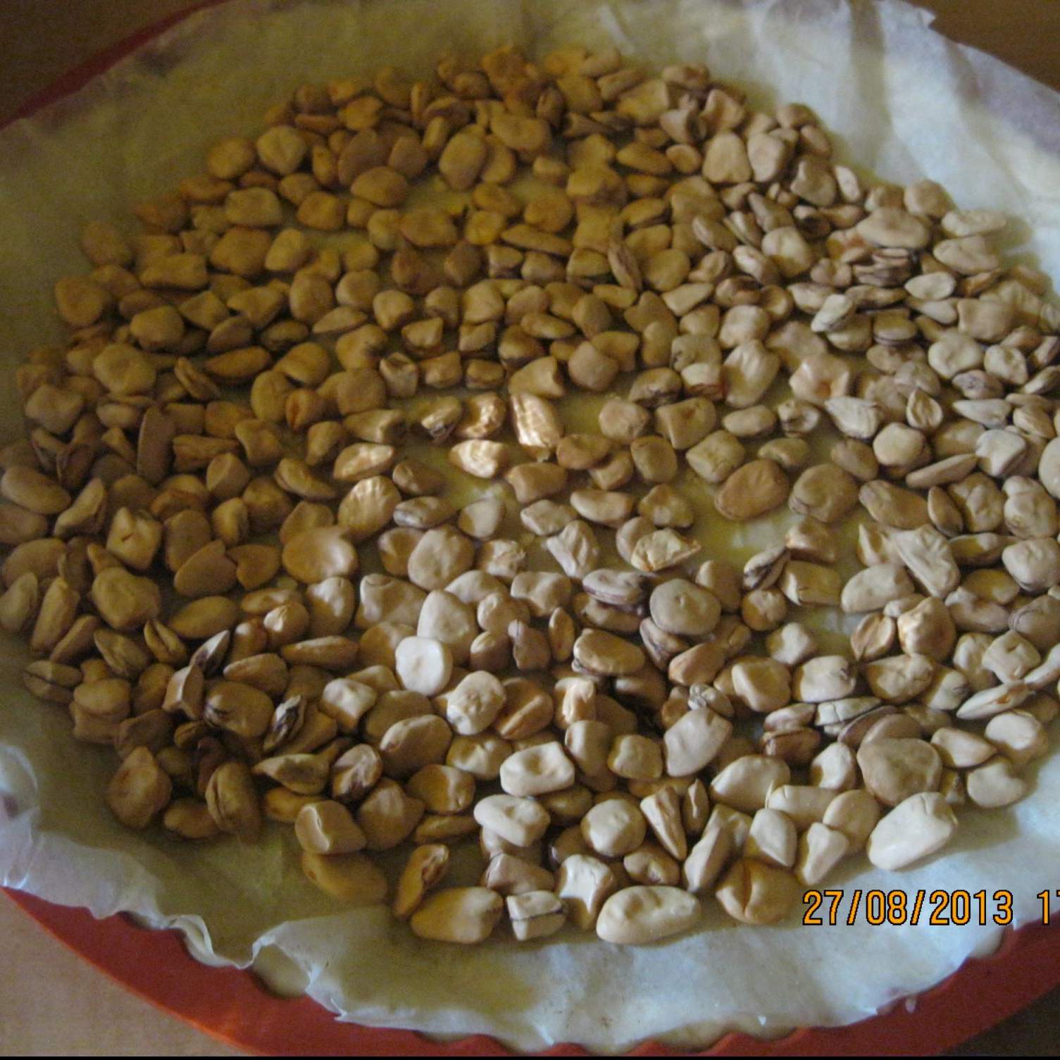 Coprire con la carta da forno e riempire con dei ceci o altrii legumi secchi (si possono riutilizzare tante volte)Mettere in forno a 200° per 10m, poi togliere i legumi e rimettere in forno per altri 10m.