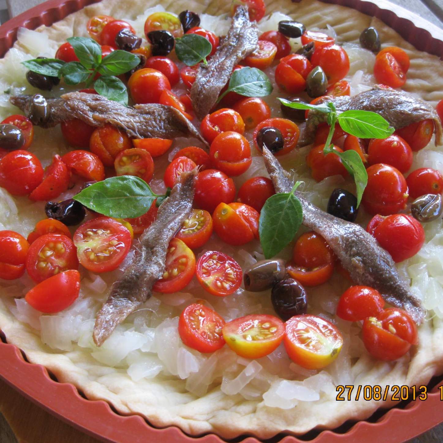 Riempire il guscio di pasta con le cipolle , distribuire i pomodorini tagliati a metà i capperi, le olive e le alici , irrorare con un filo di olio e infornare per 10/15m.
