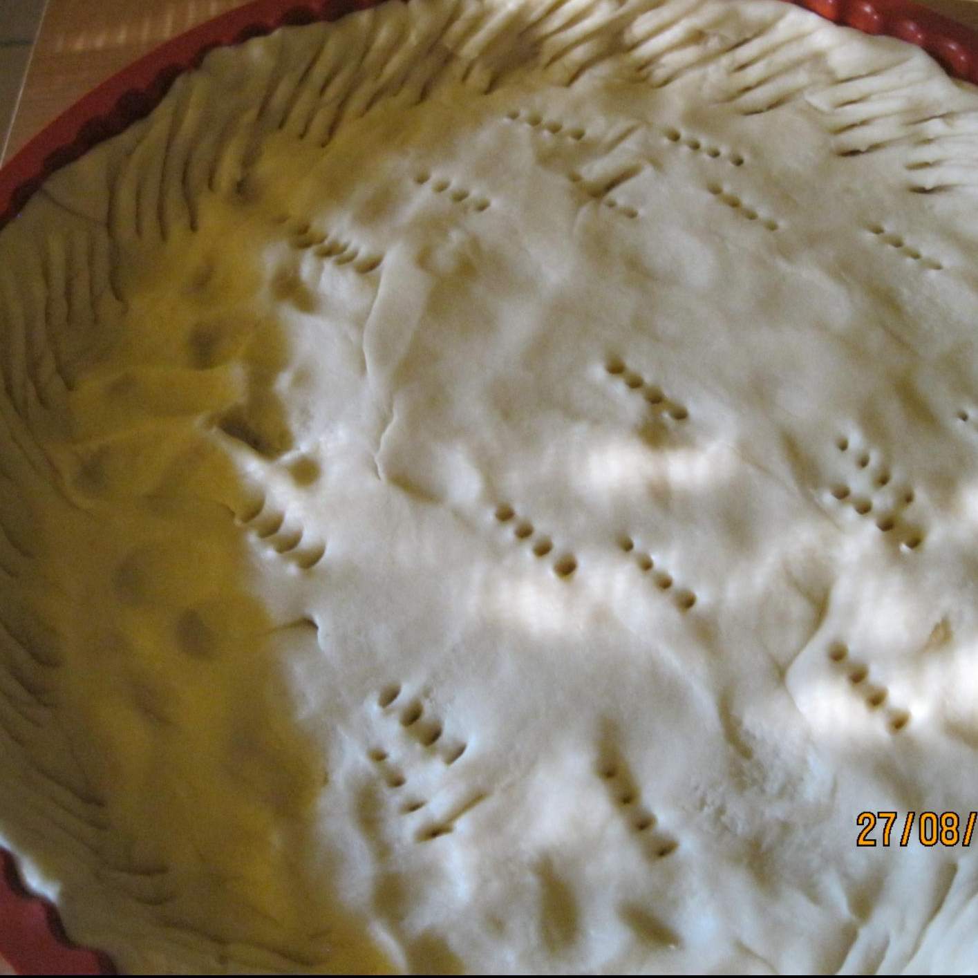 Foderare una teglia per crostate bucherellando il fondo con i rebbi della forchetta
