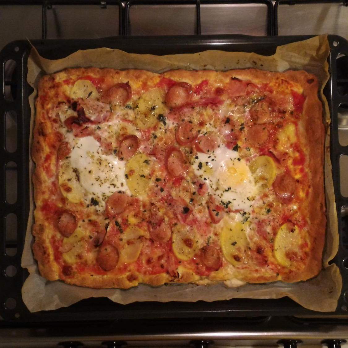 4. Stendere l'impasto e condirlo in ordine con la passata di pomodoro, la mozzarella, le fettine di patata, il wurstel, il prosciutto cotto a fette. Rompere le 4 uova in prossimità dei 4 angoli. Aggiungere un po' di sale, il pepe, l'origano, il basilico e un filo d'olio evo.