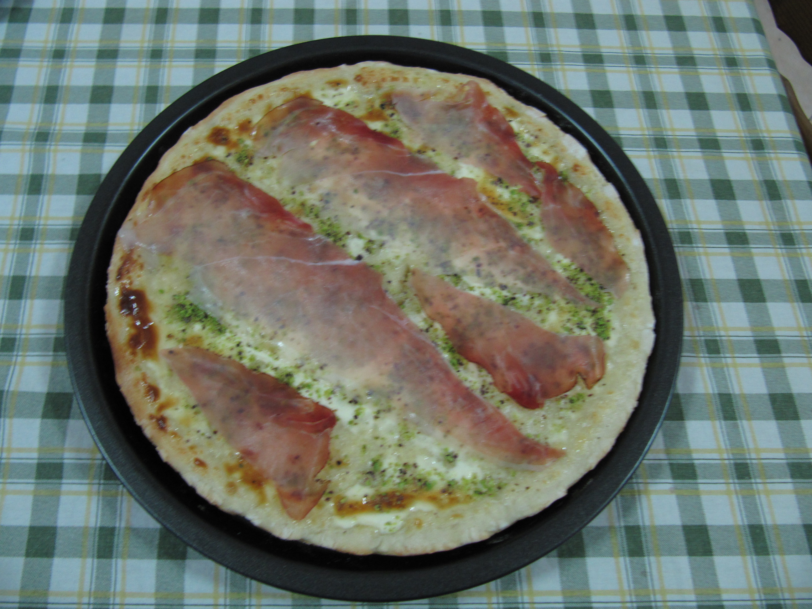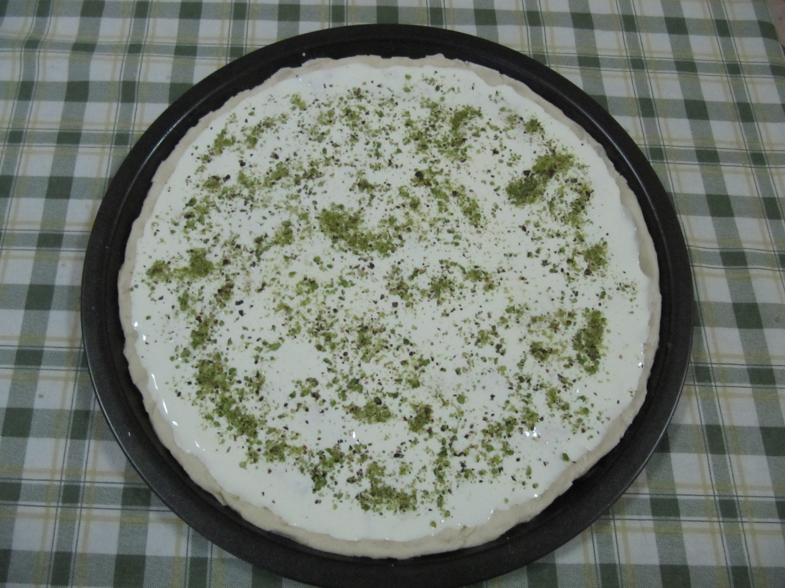 Distribuire sul fondo di ogni pizza la panna, un pizzico di sale, un pizzico di pepe e una spolveratina di granella di pistacchio. Continuare con le fettine di speck e il trito di mozzarella; infine irrorare con poco d’olio d’oliva.