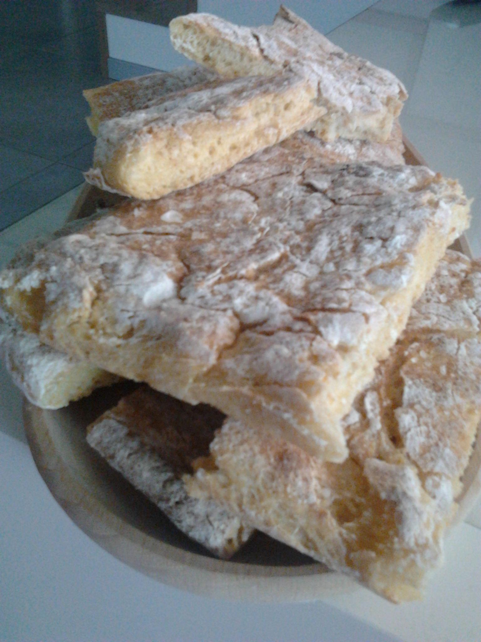 "velocità spiga" .L'impasto sarà molto appiccicoso,aiutandosi con la spatola trasferiscilo con una terrina infarinata e lascia lievitare almeno 6 ore coperto con un canovaccio.Quindi stendilo con un matterello infarinato(io come si può vedere dalle foto ho un pò esagerato con la farina!!!) ad uno spessore di circa 1,5 cm in una teglia antiaderente (io ho utilizzato la leccarda con carta forno),cospargi la superficie con chicchi di sale grosso e fai riposare ancora per 30 min.