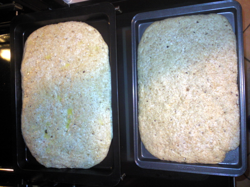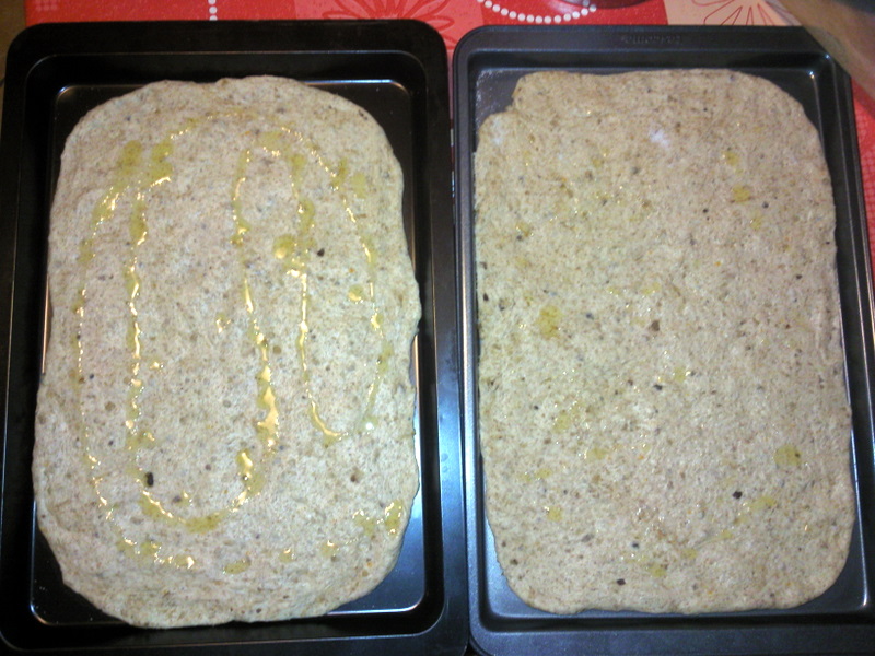 Dividere in 2 l'impasto senza lavorarlo, stenderlo su 2 teglie allargando la pasta con le dita; non è necessaria la carta forno.