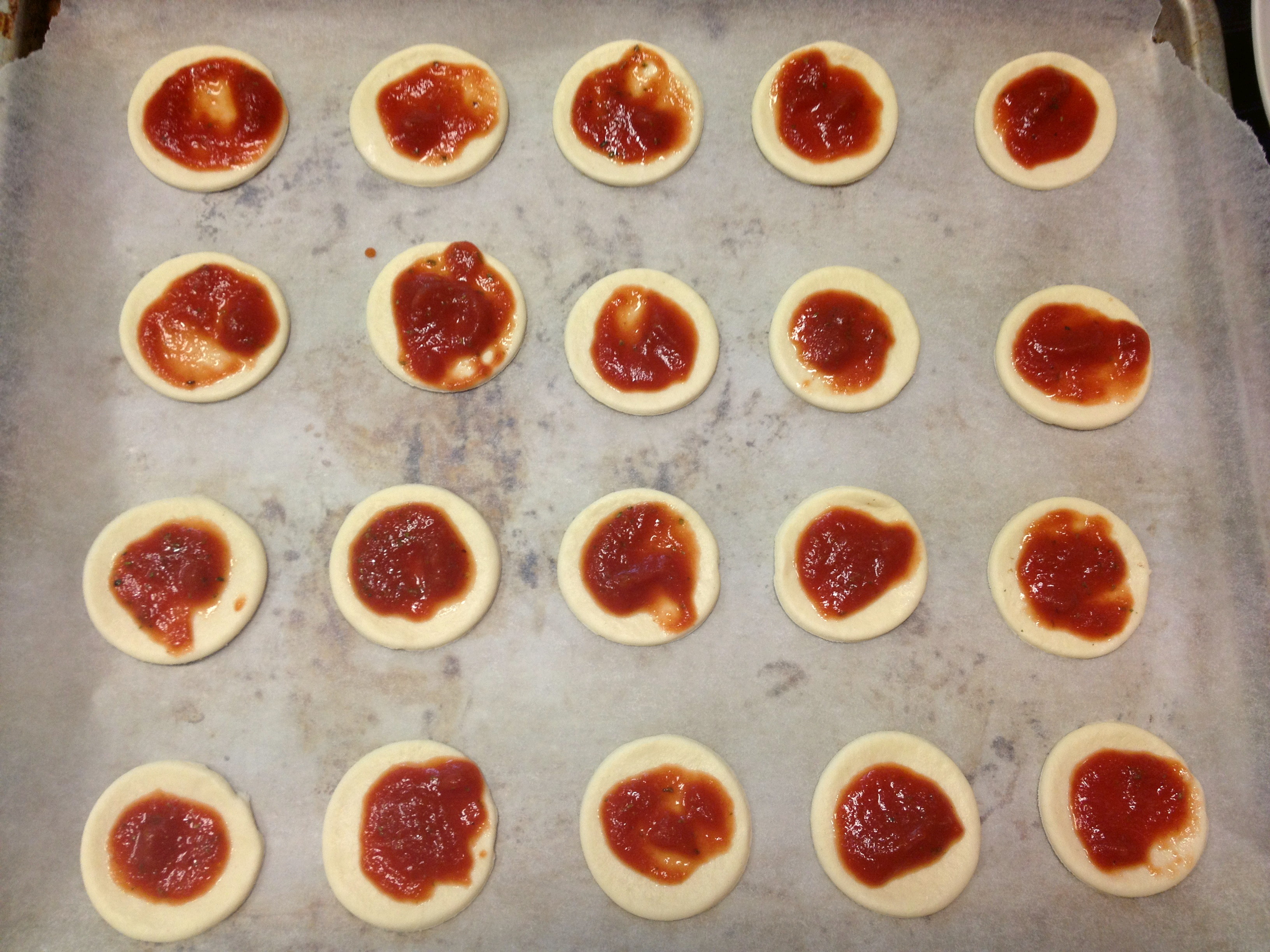 - Farcire ciascun dischetto con uno strato di salsa e qualche cubetto di mozzarella.