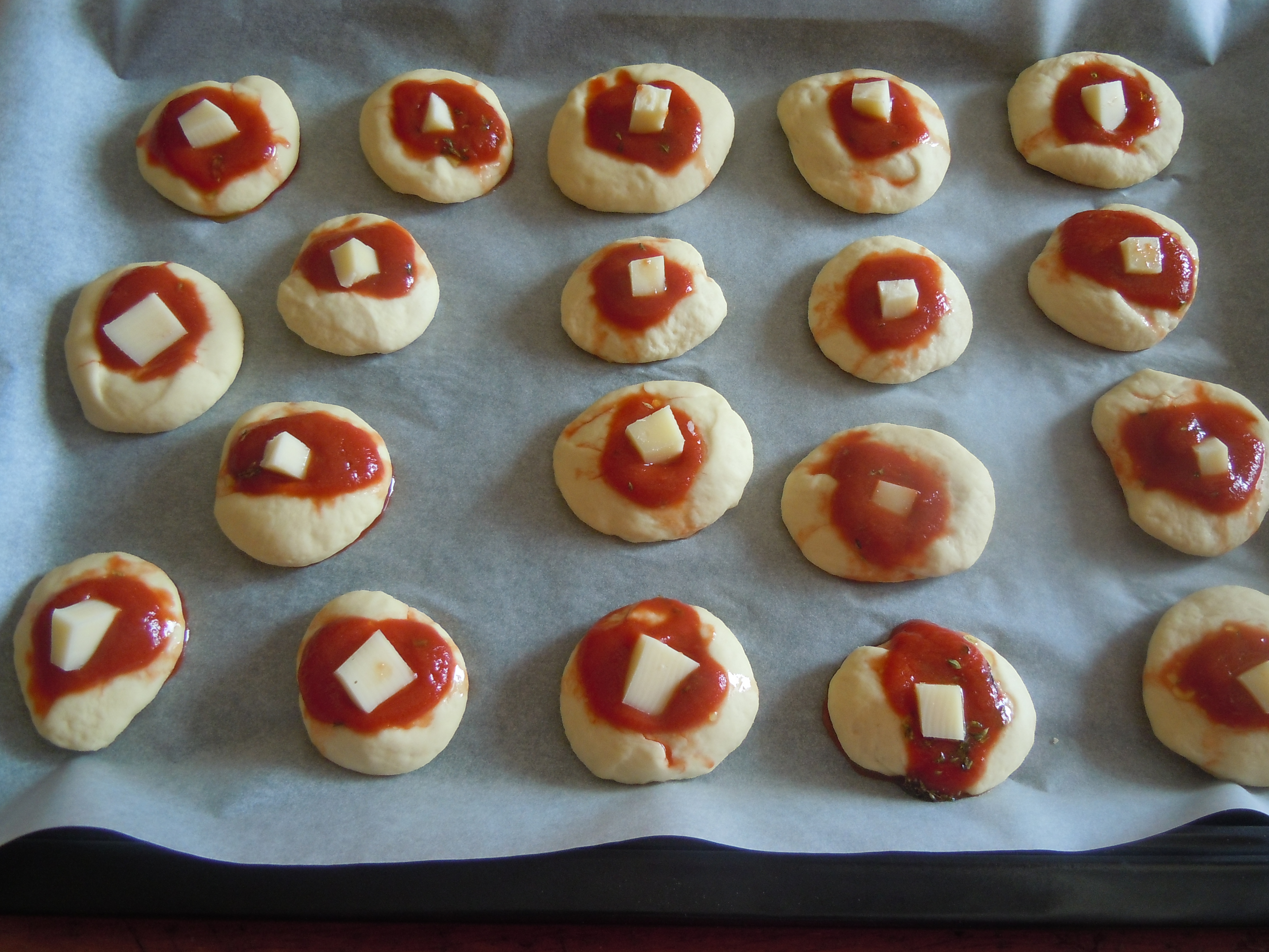 Mettete su ogni pizzetta mignon un po' di passata di pomodoro e un pezzetto di formaggio (io uso il galbanino).