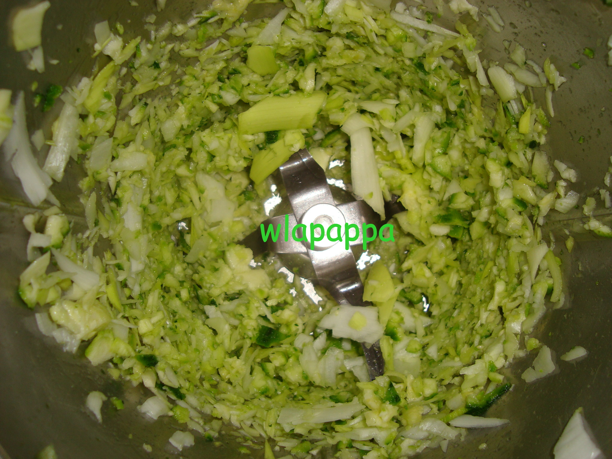 "coperchio chiuso" il porro e la zucchina, precedentemente lavati e tagliati a pezzi grossi, due colpi di turbo. Con la spatola riunire il trito sul fondo, aggiungere olio e pancetta e cuocere 5 min. 100°