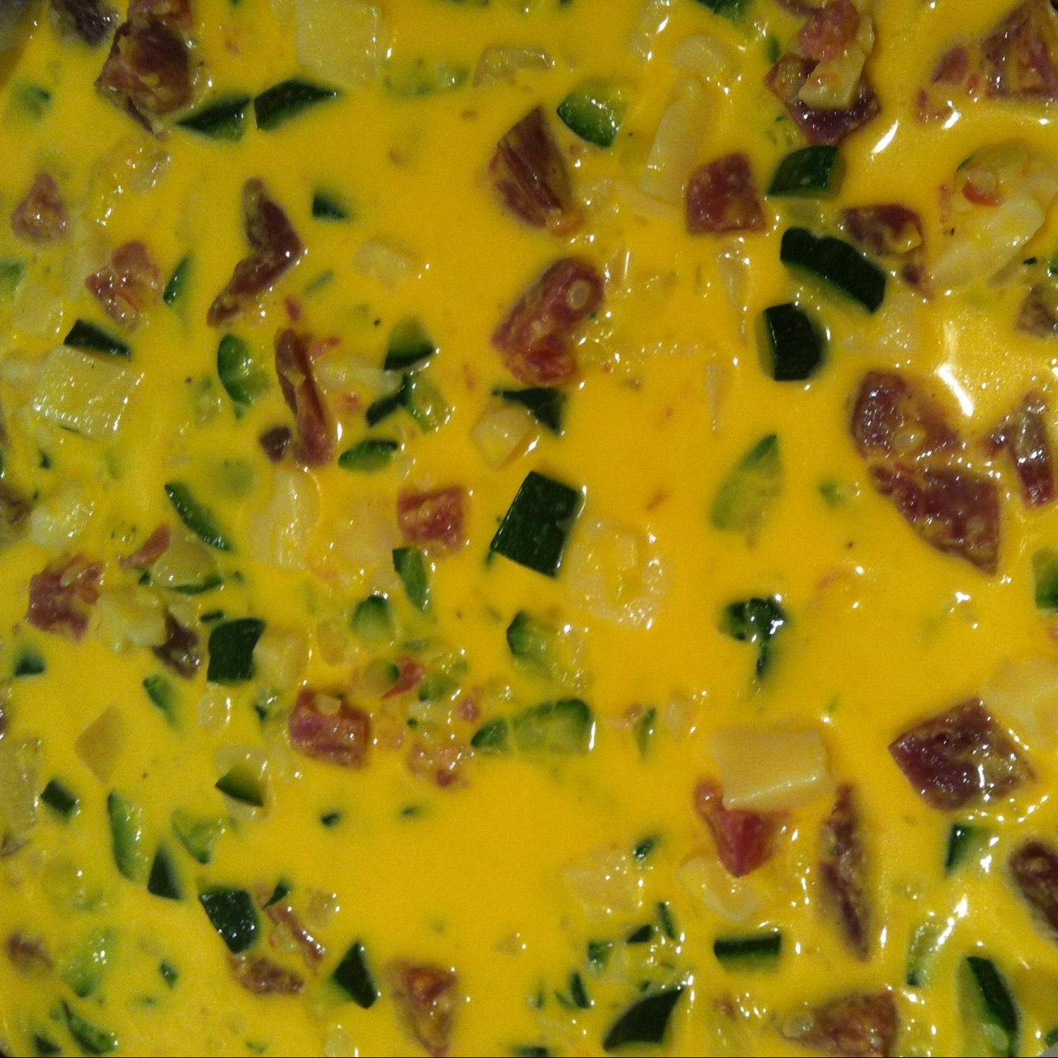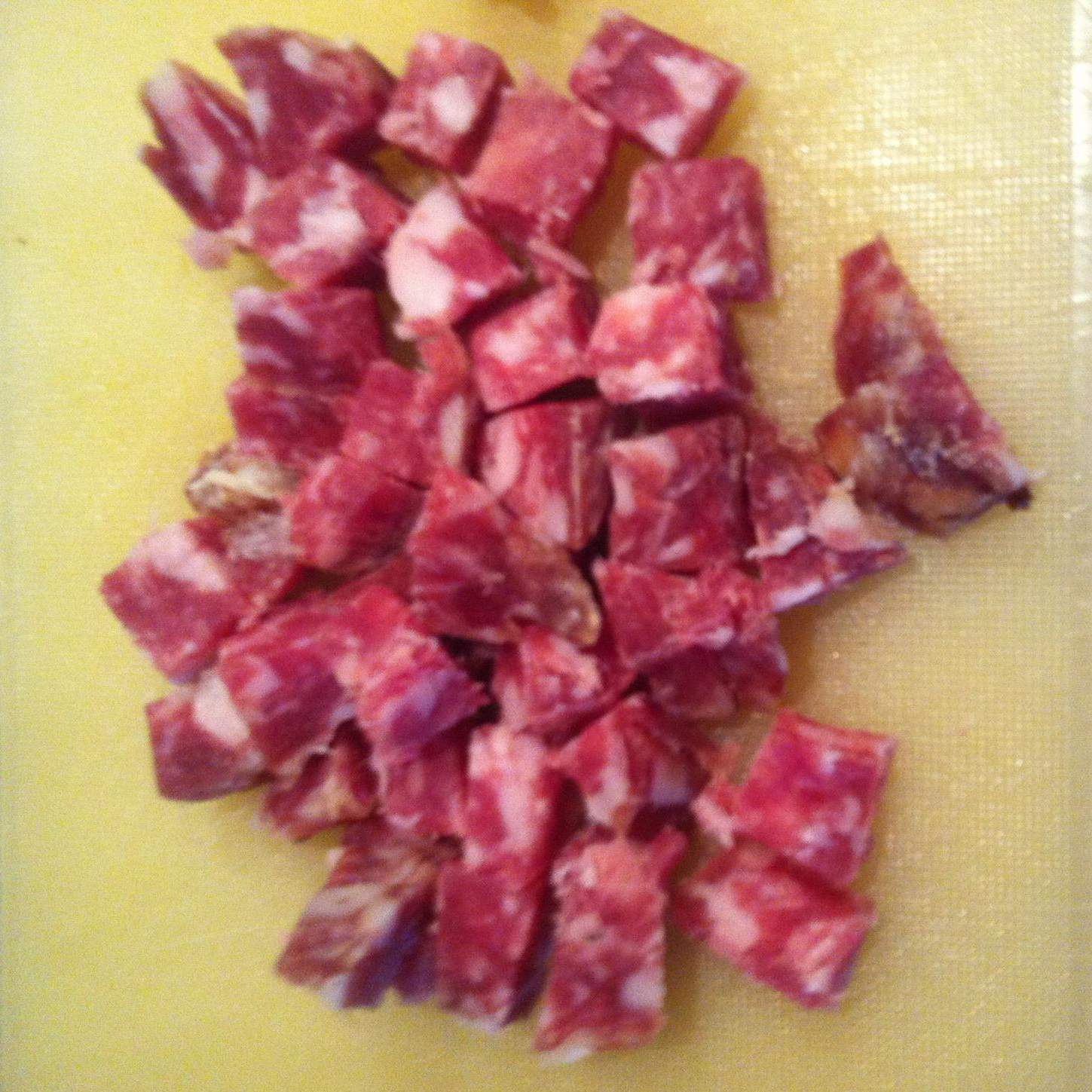 Aggiungere il salame e i formaggi tagliati a tocchetti, le uova, la panna, il latte, sale e pepe: 30 sec. vel. 3.