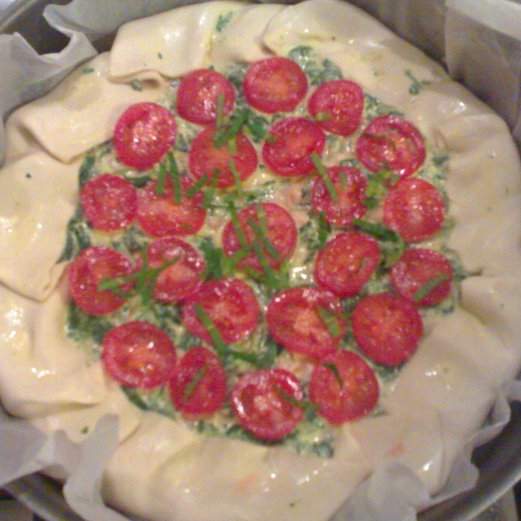 "coperchio chiuso" il contenuto di verdure, uova e ricotta, menta. Pareggiare bene il ripieno, richiudere il bordo e adagiare i pomodorini tagliati a metà. Distribuire ancora un po' di menta sulla superficie e infornare per 30/35 min in forno statico a 180°.