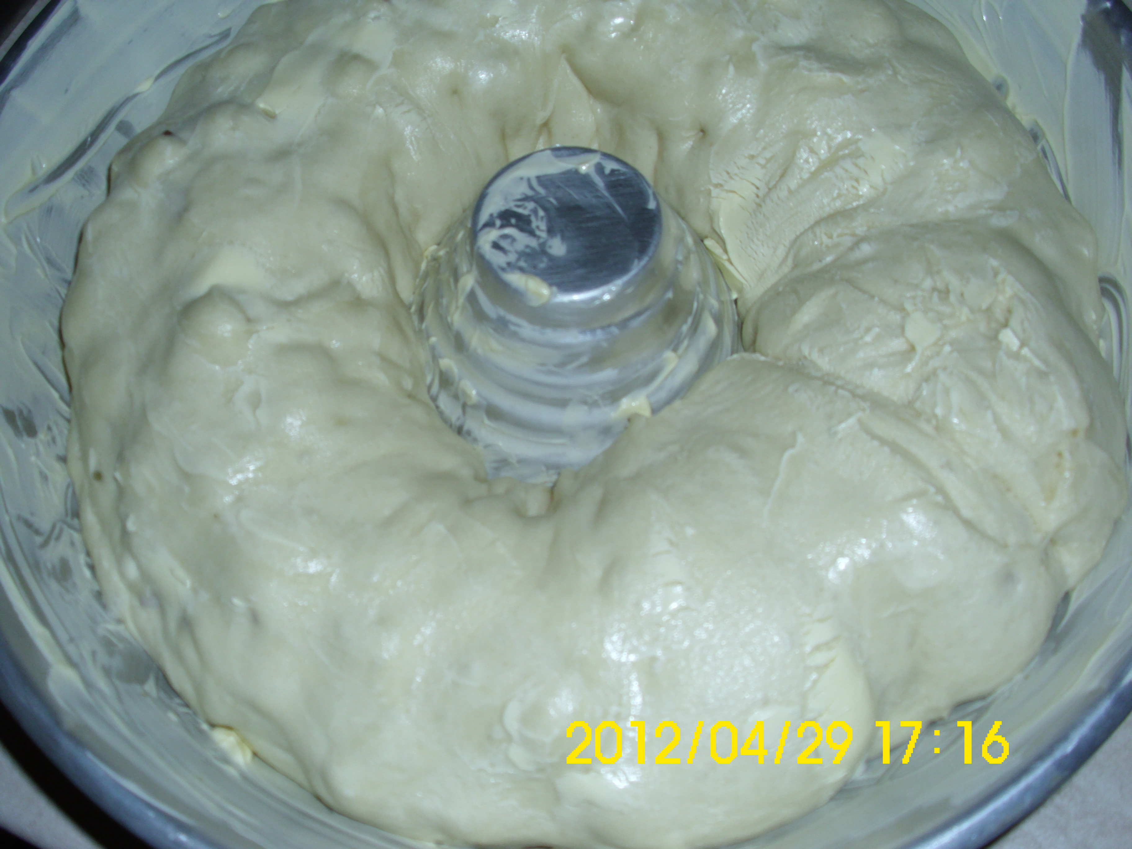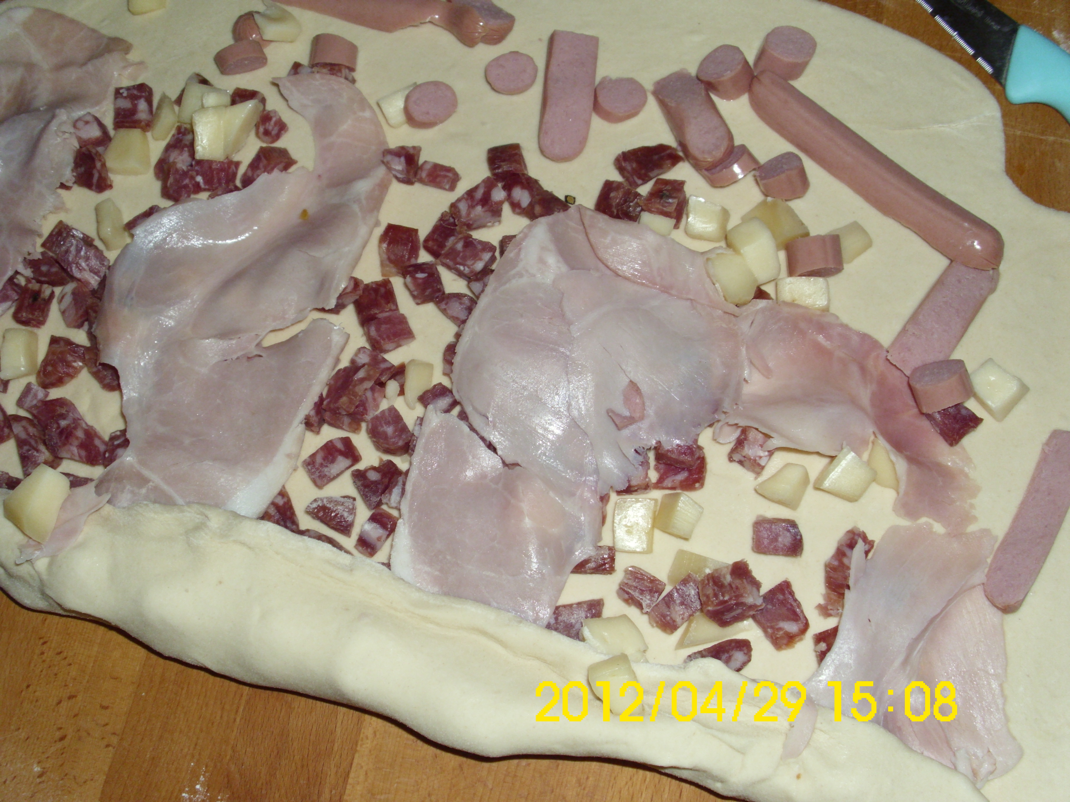 "velocità spiga" mettere l'impasto sul piano da lavoro infarinato se risultasse appiccicoso aggiustarlo con altra farina e lavorarlo a mano ancora un po',dopodiche stendere la pasta dargli una forma rettangolare farcire con il salame prosciutto e formaggio arrotolare dal lato lungo e sistemare in uno stampo a forma di ciambella imburrata lasciare lievitare fino al raddoppio,spennellare con olio, o margarina, infornare a forno statico a 180°(far fede al proprio forno)x 40min.