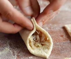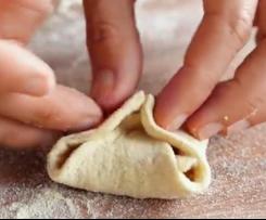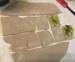- Stenderlo bene col matterello per ottenere una sfoglia di un cm. Intanto mettere la verza cotta in un piatto scolando il liquido in eccesso e adagiare dei mucchietti di verza su ogni quadrattino